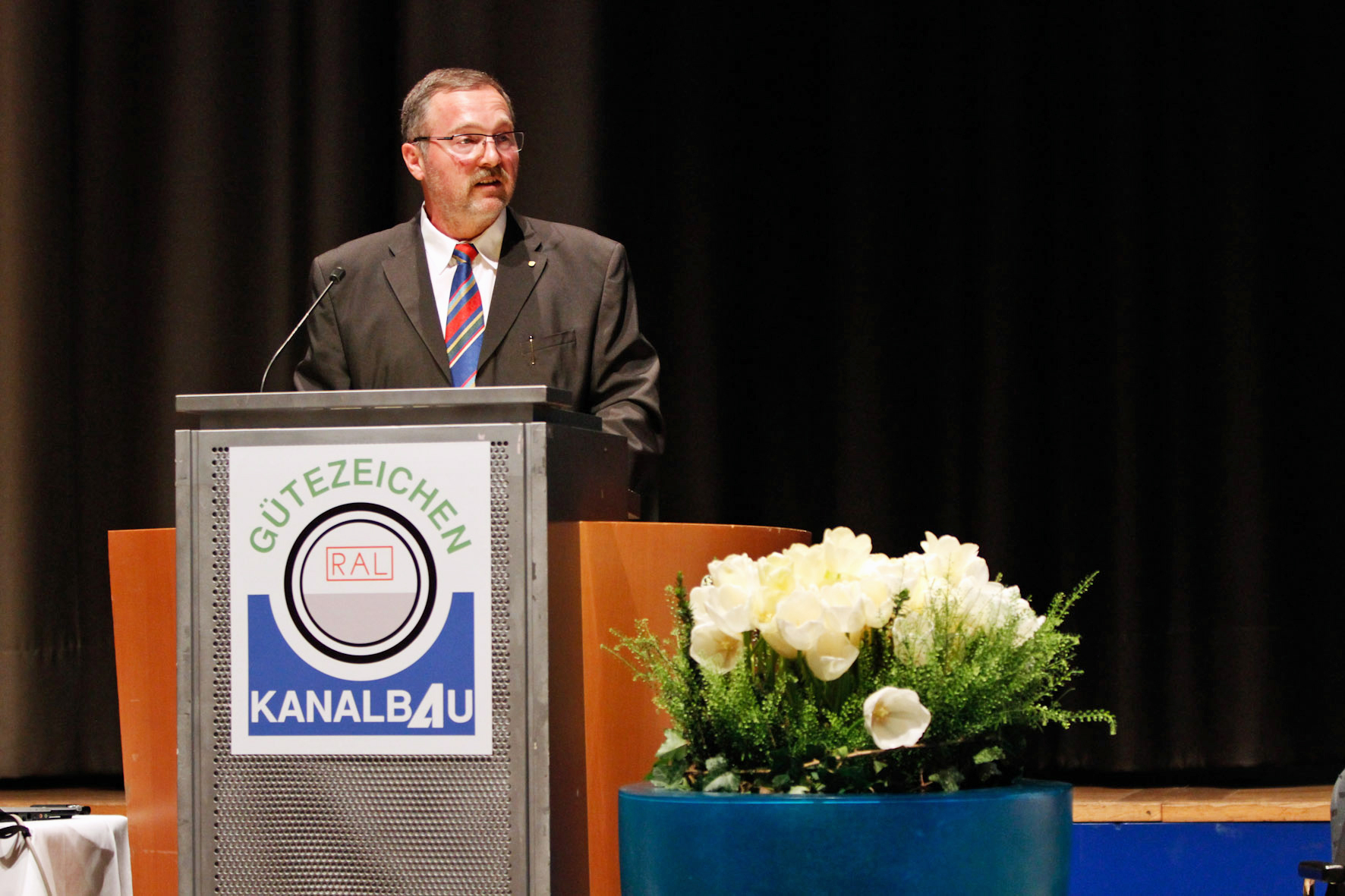 In seiner Begrüßungsrede ging der stellvertretende Vorstandsvorsitzende Jacobi auf die Entwicklung der Gütegemeinschaft ein. Die positive Bilanz: Die Zahl der Mitglieder hat sich von 3.184 auf 3.229 erhöht. Mehr als 5.000 Auftraggeber und Ingenieurbüros fordern Gütesicherung in ihren Ausschreibungen und nutzen das Gütezeichen als Eignungsnachweis für die Auswahl von Firmen und für einen fairen Wettbewerb zwischen den Bietern. „Das verdanken wir einem guten Konzept, das in den letzten 20 Jahren im Konsens zwischen Auftraggebern und Auftragnehmern entwickelt wurde, mit zuverlässigen Strukturen und Beteiligten, die das uneingeschränkte Vertrauen genießen“, stellte Jacobi fest. Er dankte allen Mitarbeitern der Geschäftsstelle sowie den Prüfingenieuren, die im vergangenen Jahr mehr als 2.000 Firmen- und 3.500 Baustellenbesuche und zusätzlich etwa 1.000 individuelle Beratungstermine bei Auftraggebern durchgeführt haben. Darüber hinaus nahmen etwa 11.500 Personen an Weiterbildungsmaßnahmen der Gütegemeinschaft Kanalbau teil.