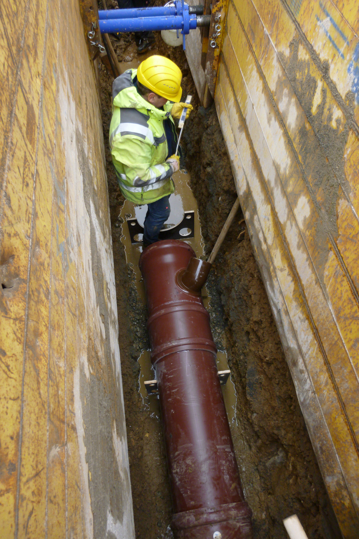 Zum Einsatz kamen braune Rohre DN/OD 315 aus dem HS®-Kanalrohrsystem von Funke. Insbesondere die Werkstoffeigenschaften sowie der Systemcharakter der Kunststoffrohre haben zu der Entscheidung beigetragen: HS®-Rohre sind Vollwandrohre aus PVC-U mit erhöhter Wanddicke und einer Mindestringsteifigkeit von 12 kN/m2.