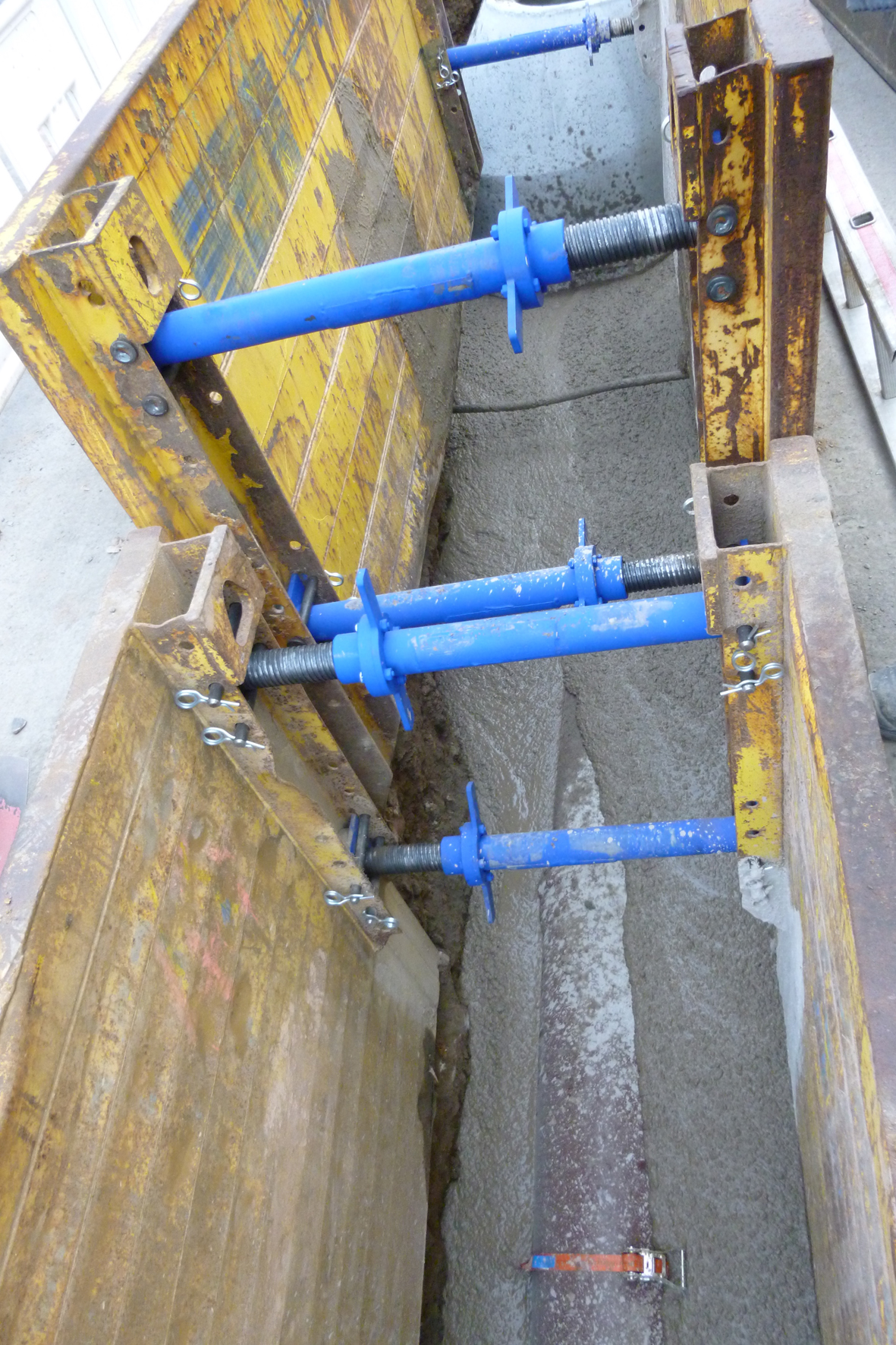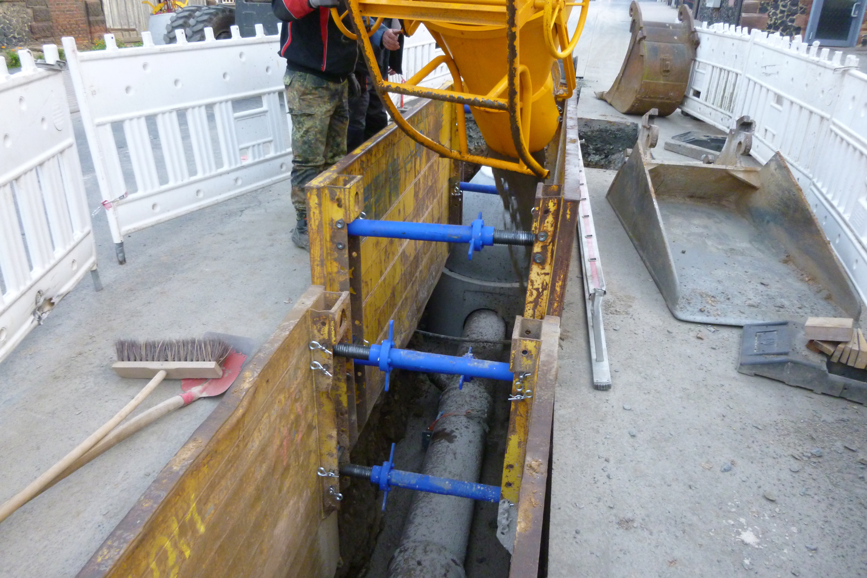 Der Aufbau der Auftriebssicherung ist den Anforderungen der unterschiedlichen Rohrdurchmesser und den daraus resultierende Auftriebskräften angepasst. Für den Einsatz im bis zu 2,50 m tiefen und bis zu 1,25 m breiten Graben in Gensungen kam eine modifizierte Version der Sicherung mit größerem Auflager und leicht reduzierter Höhe zum Einsatz. Zunächst wurde die Sohle begradigt, dann die Auftriebssicherung über die gesamte Länge der Haltung mit einem Abstand von jeweils 2 m aufgestellt. Nach dem Auflegen der Rohre wurden diese mit einem Spanngurt fixiert. Im Anschluss wurde in zwei Schritten der Flüssigboden eingebracht. Bei Verwendung der Funke Auftriebssicherung wird zunächst bis zur Unterkante Rohr verfüllt.