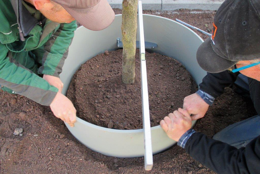 Für das leichte Einbringen des Gießrings in die Pflanzgrube sorgt die gewellte Unterkante des Bauteils in der Nennweite DN 800. Zusätzliche Formstabilität gewinnt der Gießring durch eine innen angebrachte Arretierung, die beim Setzen einfach mit der Hand verriegelt wird.