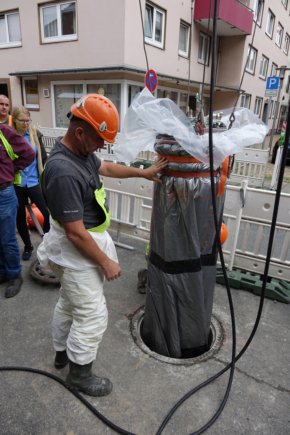 Das Ganze dauert gerade einmal zwei bis drei Stunden – ein Aspekt, von dem sich neben den Auftraggebern auch die Gäste im Rahmen der Baustellenpräsentation überzeugen konnten. „Nach den entsprechenden Vorbereitungen ist der eigentliche Einbau in rund einer halben Stunde erledigt“, erklärt Richard Mohr, DIRINGER&SCHEIDEL ROHRSANIERUNG GMBH & Co. KG.