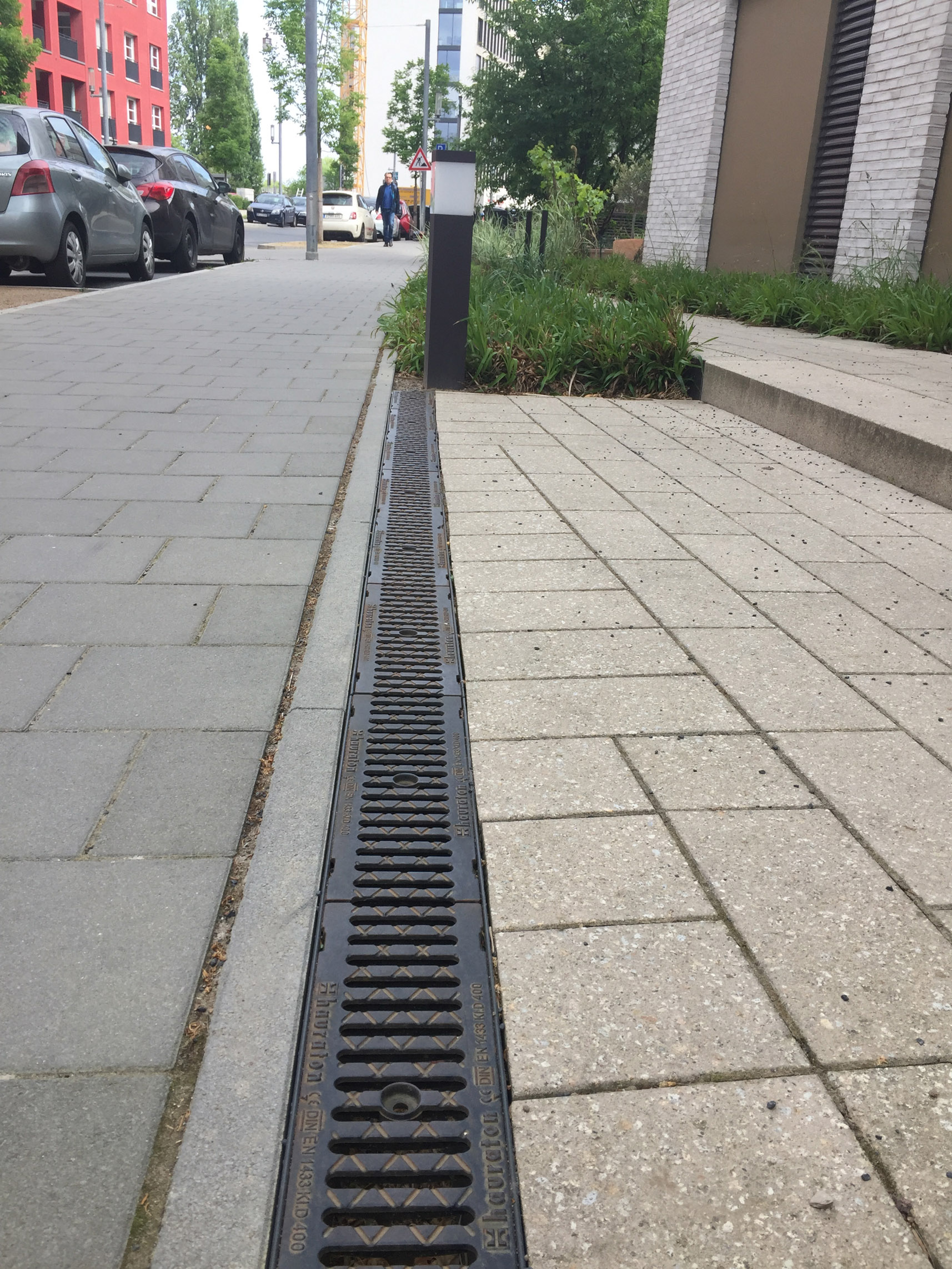 Letztere bringen das in den Rinnen gesammelte Wasser unterhalb des Oberflächenbelages auf direktem Weg zu den Ablaufpunkten. Mit dem im Rinnenboden befindlichen, anpass-baren Höhenverstellsystem konnten Niveauunterschiede einfach ausgeglichen werden.