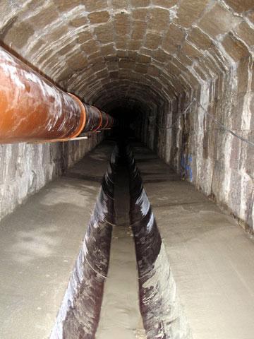 Die Abdichtung erfolgrte durch Bohrlochinjektionen, bei denen im Zwei Wege-Verfahren ein PUR-Werkstoff von MINOVA CarboTech injiziert wurde. Beim Zwei-Wege-Verfahren werden die beiden miteinander reagierenden Werkstoffkomponenten in separaten Leitungen gefördert und erst im Statikmischer unmittelbar vor den Bohrpackern gemischt, qausi währen des Injektionsvorgangs. So lassen sich extrem schnell reagierende und dichtende Werkstoffe- wie in Schwerte verwendet- einsetzen. Um das Gewölbe unter dem Bahndamm endgültig trocken zu legen, waren dennoch rund 100 Bohrungen notwendig und das in mehreren aufeinander folgenden Phasen: Hatte man erkennbare Infiltrationen unterbunden, erwiesen sich ein ums andere Mal benachbarte Fugen als undicht und das Wasser suchte und fand einen neuen Weg in den Kanal. Nachdem die Abdichtung schließlich dennoch durchgängig erfolgreich und die Fugen vollständig ersetzt waren, folgte der Einbau einer Trockenwetterrinne, bestehend aus einer Steinzeughalbschale DN 400 mit rechts und links aufbetonierten Bermen, die ihrerseits mit einem korrosionsbeständigen Mörtelsystem von Ergelit beschichtet wurden. Insbesondere dieser material-intensive Arbeitsgang war eine logistische Herausforderung, denn aufgrund erschwerter Zugänglichkeit konnte unter dem Bahndamm nur von einer Seite aus das gesamte Material über weite Strecken herangeführt werden.