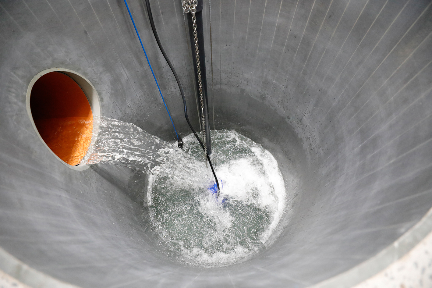 Die Arbeit der Pumpe im Schacht wird über einen Schwimmer reguliert. Ab einer bestimmten Pegelhöhe wird das Abwasser über eine Druckrohrleitung in den nächsten Schacht gefördert.