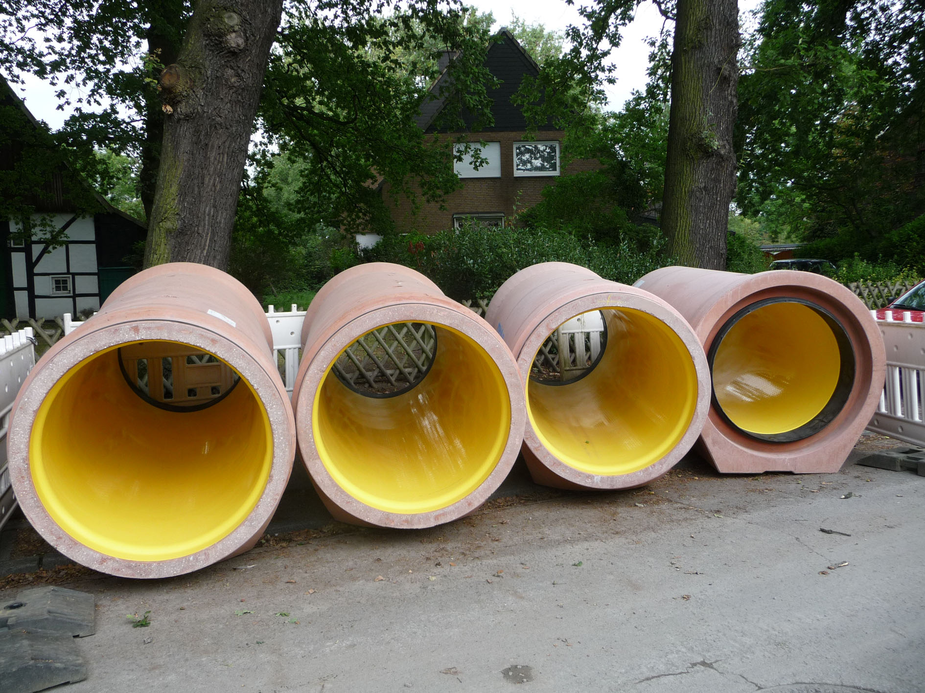 Der neue Mischwasserkanal besteht aus FBS-Stahlbetonrohren mit durchgehendem Fuß in DN 300 bis DN 1200, auf 1 km Länge und wird in 4,50 m Tiefe eingebaut. Das monolithisch aus einem Guss gefertigte Abwasserrohrsystem Perfect Pipe Plus nach DIN EN 1916 und DIN V 1201 sowie FBS-Richtlinien ist aus einem geprüften, leicht verdichtenden Beton C 40/50 mit erhöhtem Sulfatwiderstand bis 1.500 mg/l und hat aus Marketinggründen, damit man es leicht wiedererkennt, die Farbe Rot.