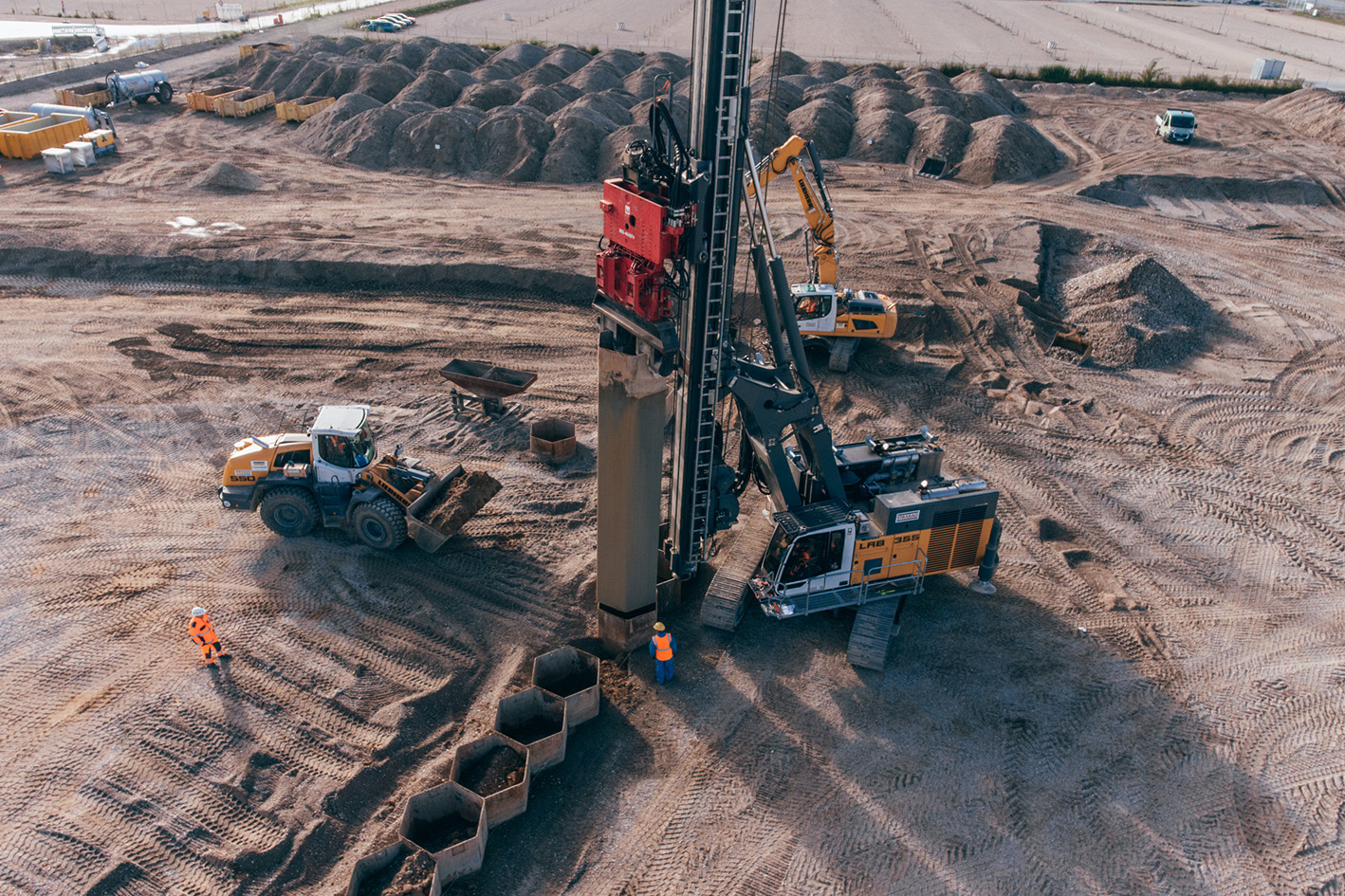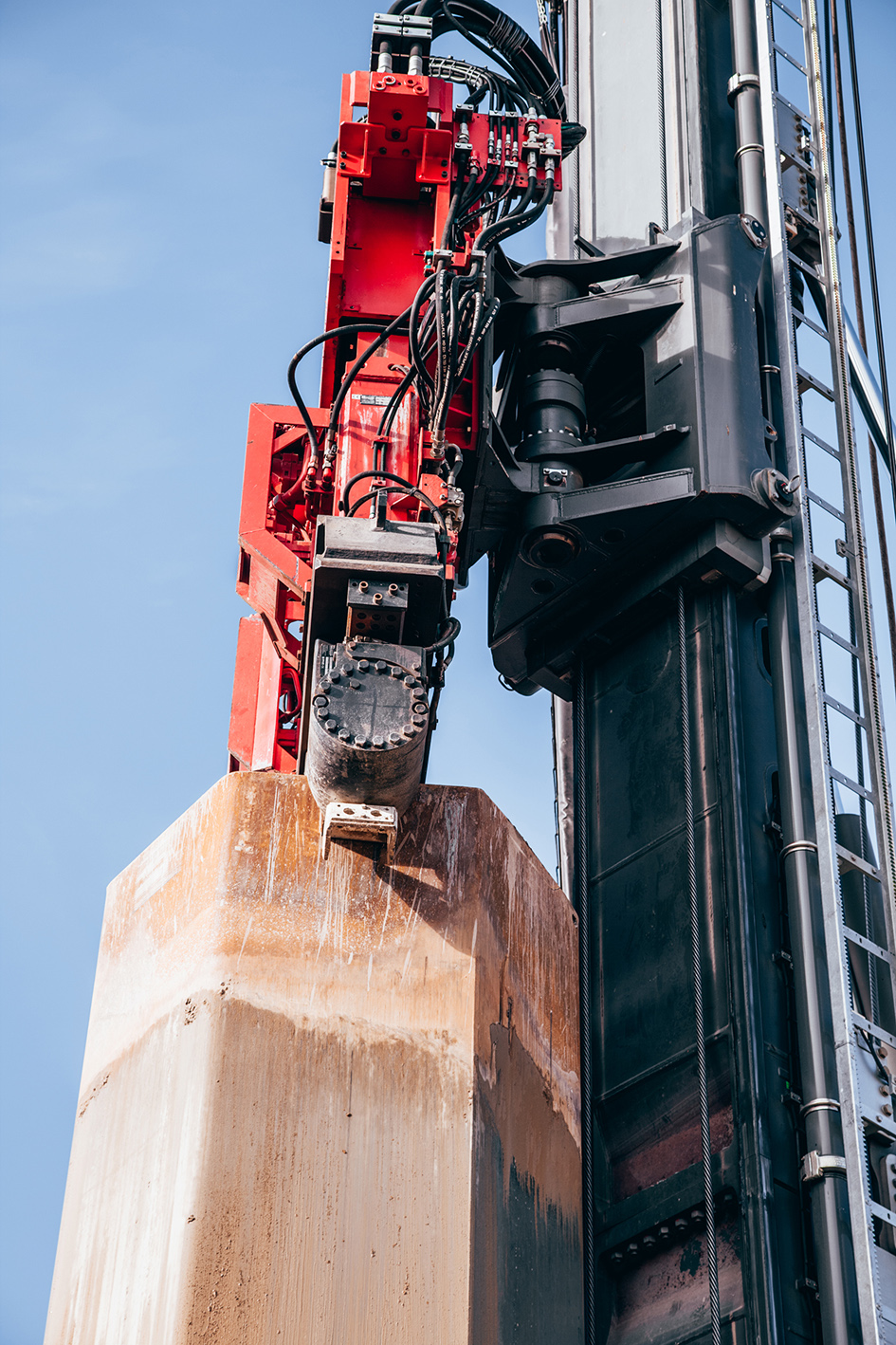 Die Idee zu dieser Kombination war laut Ernst bei der STRABAG schon länger vorhanden. Es habe allerdings bislang kein geeignetes Trägergerät gegeben, welches nicht nur sich selbst, sondern gleichzeitig auch die Vibrationsramme mit der nötigen Hydraulikleistung versorgen konnte. Ernst: „So konnten wir auf das Aggregat des Rüttlers verzichten.“ Beim Einsatz als freireitendes System müsse dies immer ‚mitgeschleppt‘ werden und das sei manchmal eher hinderlich. Als dann vor einigen Jahren das nun verwendete Liebherr-Trägergerät auf den Markt gekommen sei, seien die Pläne zur Kombination immer konkreter geworden, so Ernst weiter.