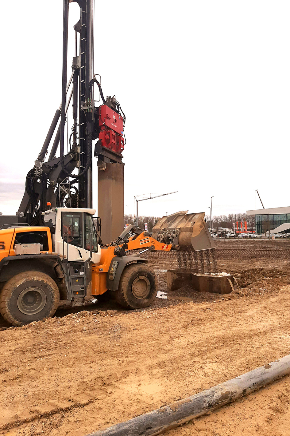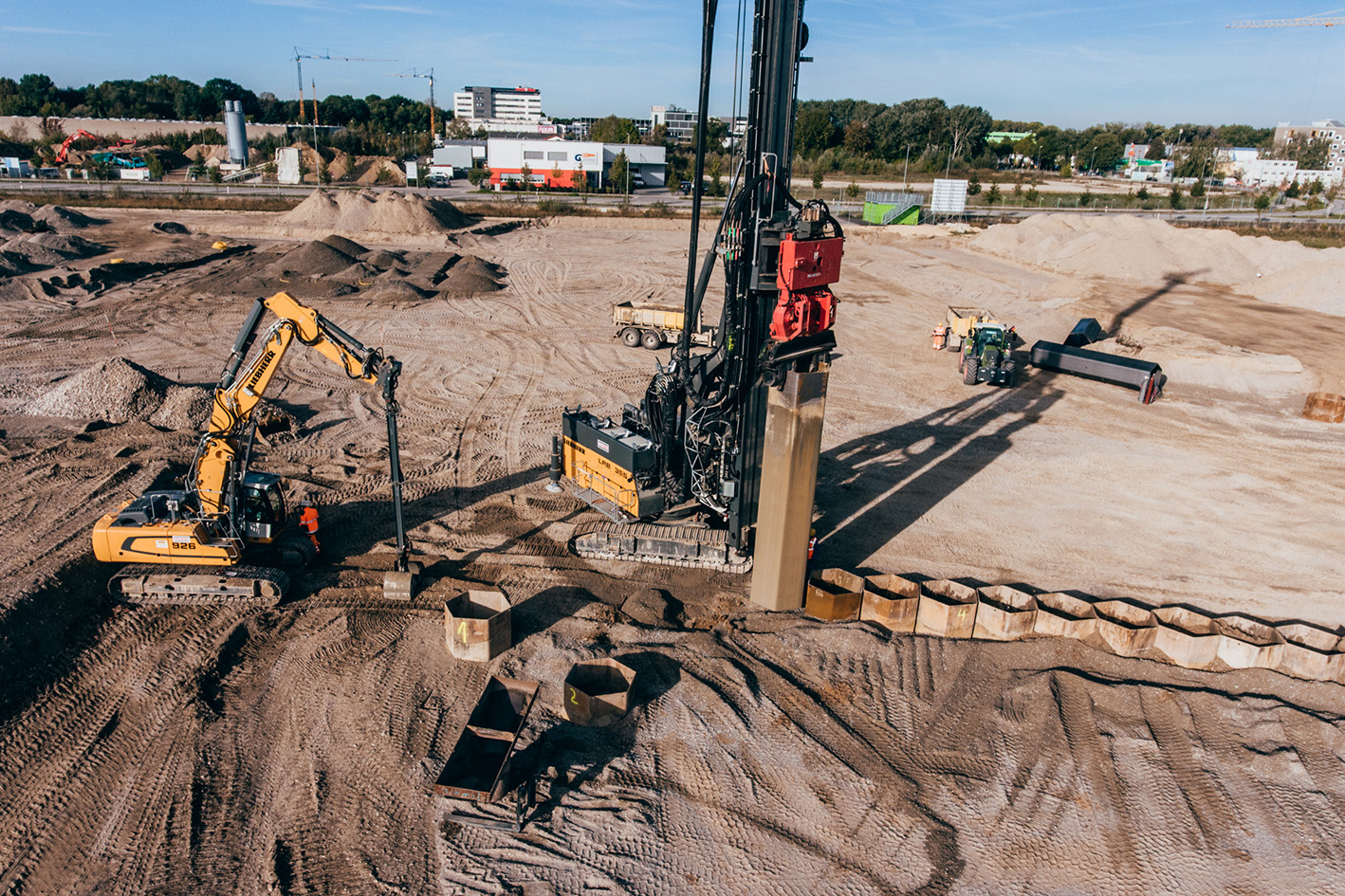 Doch bevor es soweit ist, muss das Erdreich von Altlasten befreit werden: Neben einer Abstromsicherung zum Schutz der Donauauen kam hierbei ein Dreiklang aus Air-Sparging (In-situ-Verfahren zur Entfernung flüchtiger Schadstoffe mittels Luftstroms), Wabenverfahren (Bodenaustauschverfahren) und Bodenwaschanlage zur Anwendung, wobei auch die müller Vibrationsramme von der thyssenkrupp Infrastructure GmbH eine wichtige Rolle spielte.