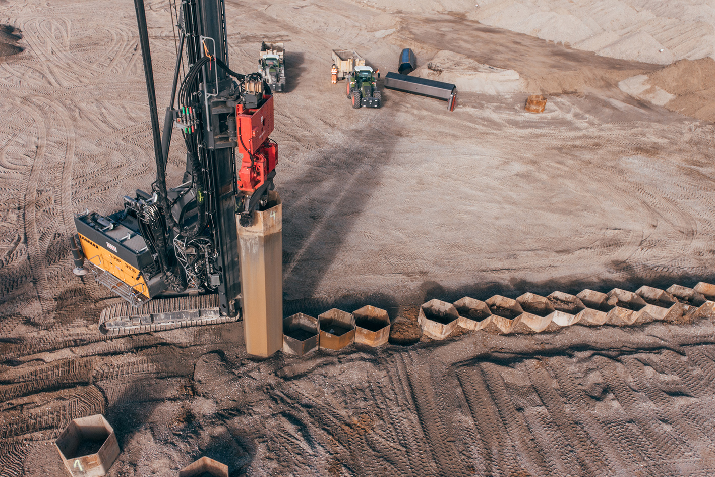 Im August 2018 wurde dann die erste Wabe in den Boden eingebracht. Der Startschuss für einen Kreislauf, der zwei Jahre anhielt: Die Vibrationsramme rüttelte immer sechs bis sieben Waben in den Boden bevor der Kettenbagger mit Greiferverlängerung und einem an die Wabengeometrie angepassten Greifer den belasteten Boden aus der Wabe holte und dieser zur Waschanlage transportiert wurde. Beim Aushub konnte die Verlängerung immer um ein Sechstel gedreht werden, sodass die Wabe passgenau geleert werden konnte.