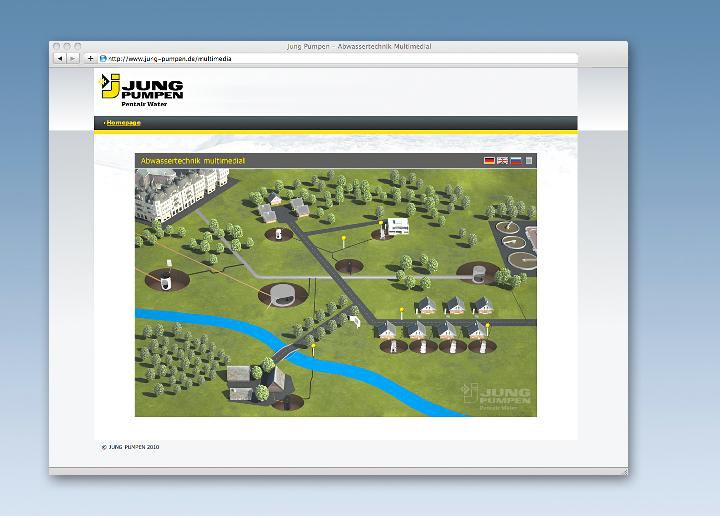 Auf www.jung-pumpen.de unter der Rubrik Produkte / Kommunale Abwassertechnik / Multimedia kann die Animation aufgerufen werden. Auf der digitalen Grafik lassen sich am Bildschirm einzelne Stationen anwählen, hinter denen sich detaillierte Erklärungen zu einzelnen Themen verbergen. Informiert wird dabei über die Funktion einer Pumpstation, die grabenlose Rohrverlegung, den Systemvergleich von Druckentwässerung und Freigefälle sowie das Horizontal-Spülbohrverfahren. Außerdem wird erläutert, wie die Bildung von Faulgasen im Abwasserkanal zuverlässig vermieden werden kann.