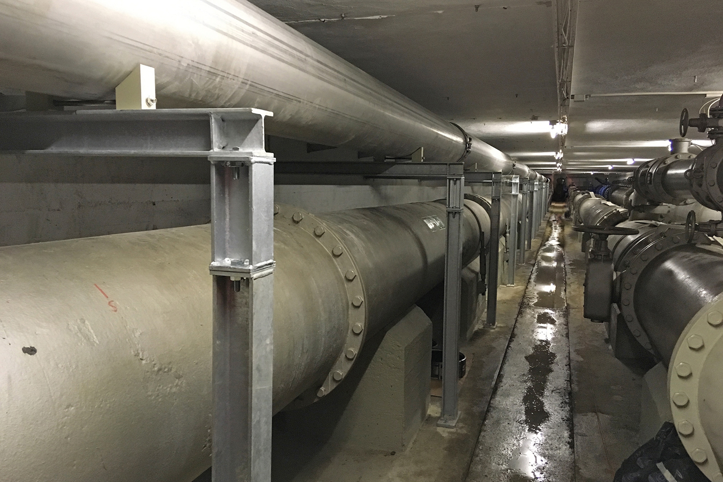 Dem Einbau der neuen Rohrleitung vorausgegangen war die Außerbetriebnahme und Demontage einer alten Stahlleitung DN 800 in dem Tunnelbauwerk. Sie wurde auf einer Länge von 65 m durch eine neue, kleinere Edelstahlleitung DN 400 ersetzt, die auf einer von Markgraf montierten Bühne verlegt wurde. Die Leitung DN 400 dient speziell der Wasserversorgung von Rüsselsheim.