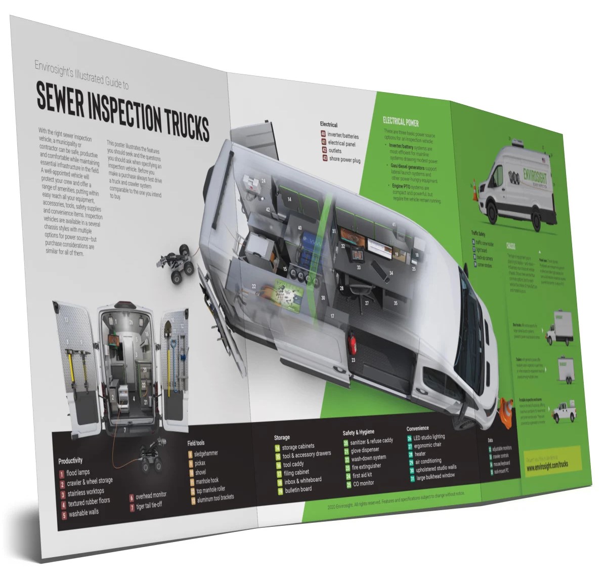 Envirosight's poster serves as a guide to help you visualize the range of vehicle types and features, and determine the wants and needs of your crew before you buy. The new, FREE poster can be used to designing your vehicle and choosing features to help you make the most of every minute at a manhole.