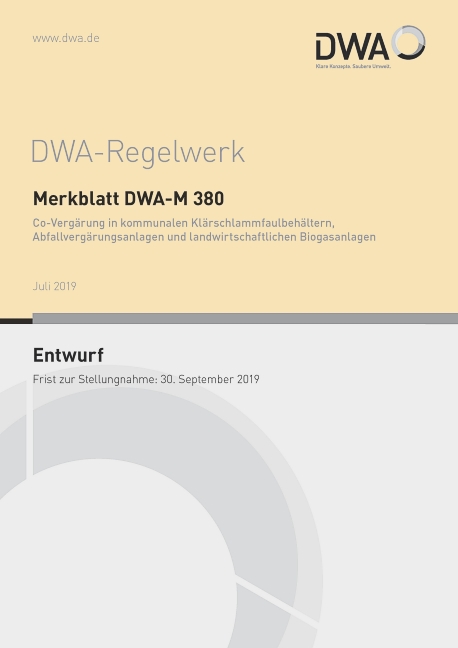 Die Deutsche Vereinigung für Wasserwirtschaft, Abwasser und Abfall e. V. (DWA) hat den Entwurf des Merkblatts DWA-M 380 „Co-Vergärung in kommunalen Klärschlammfaulbehältern, Abfallvergärungsanlagen und landwirtschaftlichen Biogasanlagen“ vorgelegt, der hiermit zur öffentlichen Diskussion gestellt wird, und das Merkblatt DWA-M 383 „Kennwerte der Klärschlammentwässerung“ veröffentlicht.