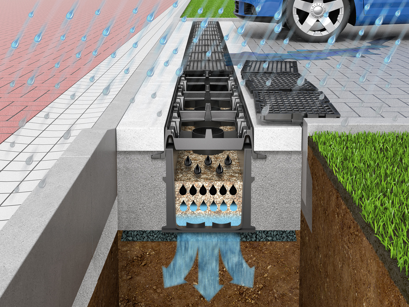 „Das in der 37 cm hohen Kunststoffmulde zum Einsatz kommende D-Rainclean®-Substrat hält dank seiner Kornzusammensetzung einen Großteil der Schwermetalle zurück. So wird das Wasser durch Ionenaustausch, Fällung, Einlagerung, Filtration und biologischen Abbau gereinigt und anschließend ohne Grundwassergefährdung in unbedenklichem Zustand in den Boden abgegeben“, beschreibt Ralph Mayer, Fachberater Außendienst der Funke Kunststoffe GmbH, die Funktionsweise der Sickermulden. Für zusätzlichen Stauraum und zur Verbesserung der Sickerleistung wurden in Mannheim unter den D-Rainclean®-Elementen Kies-/Schotterrigolen eingebaut. In der Donarstraße kam D-Rainclean® auf 90 m Länge, in der Walkürenstraße auf 100 m Länge zum Einsatz.