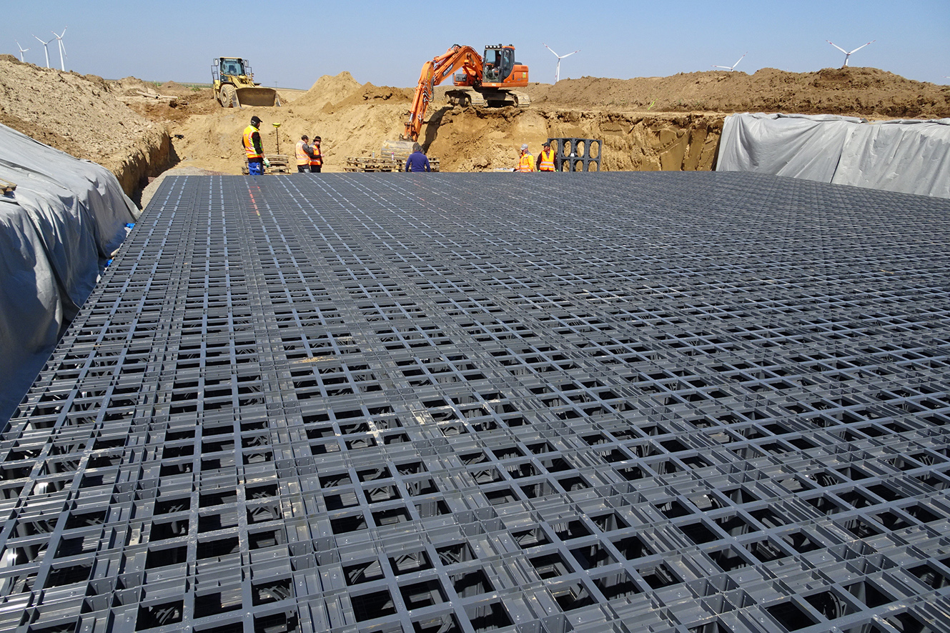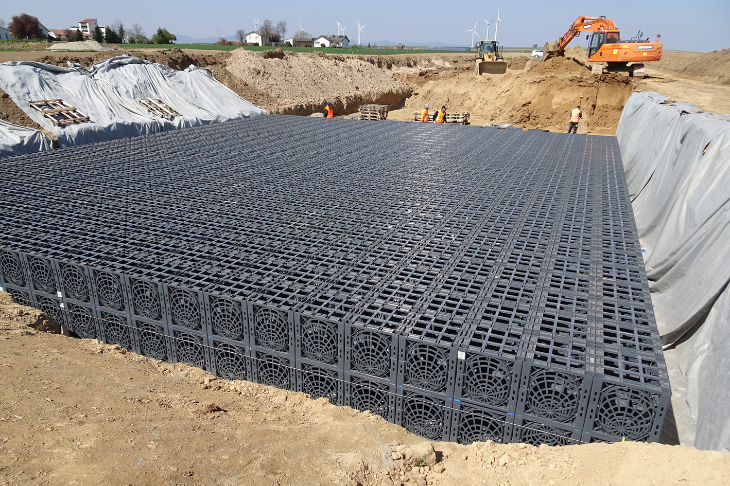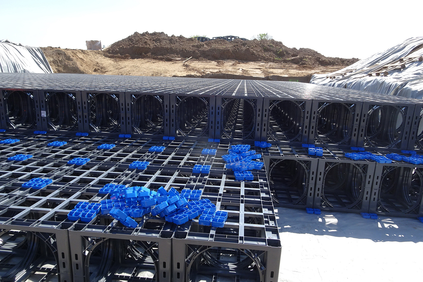 Die widerstandsfähigen Kunststoffelemente des Systems D-Raintank 3000® haben die Maße L x B x H 600 x 600 x 600 mm und sorgen dank ihrer stabilen Konstruktion für eine optimale Kraftübertragung ins umliegende Erdreich. In Herxheim wurden je 155 Tanks in 25 Reihen zweilagig angeordnet. Blaue Vierfachverbinder stellen dabei sicher, dass die Lagen nicht verrutschen können.