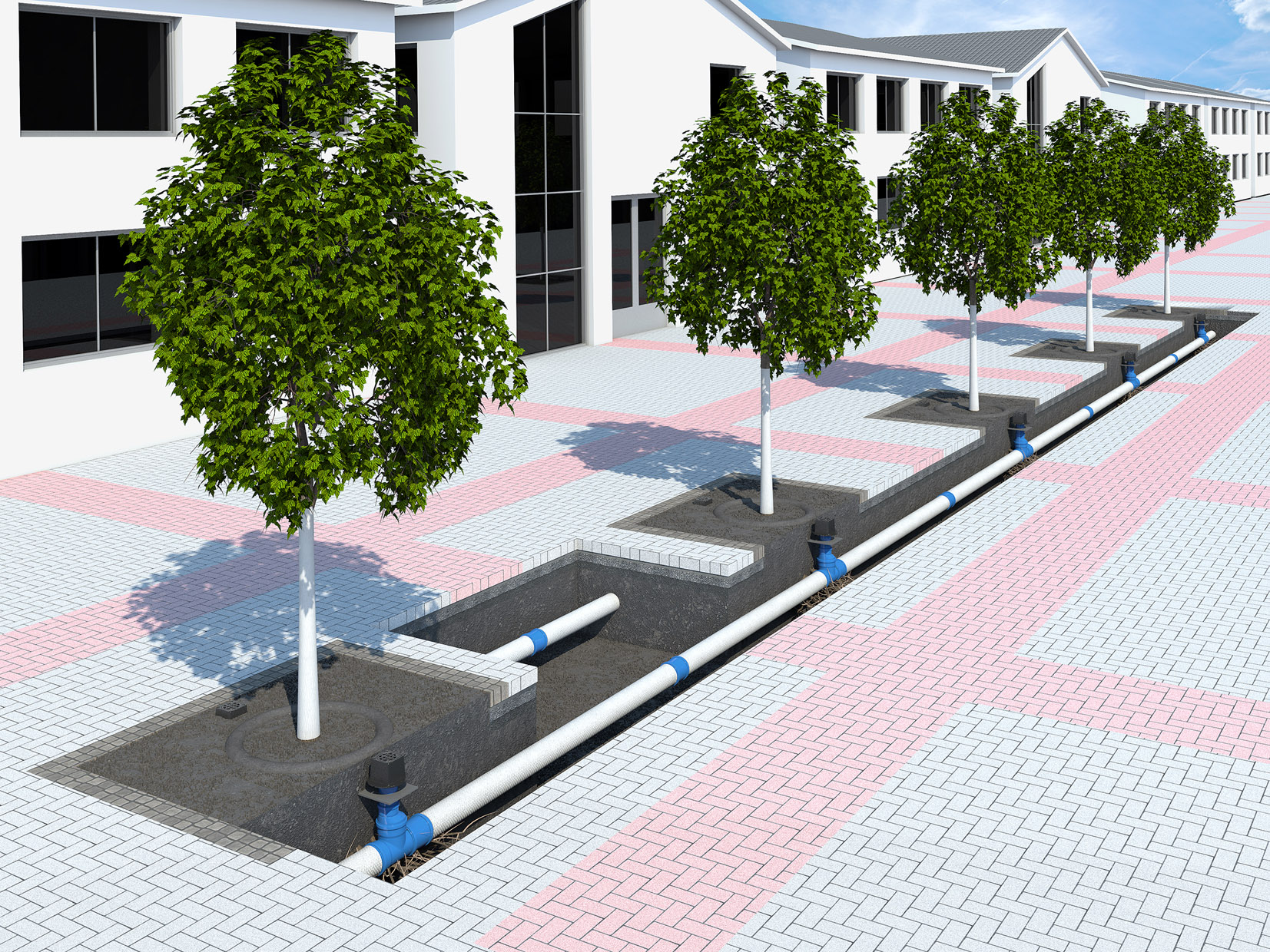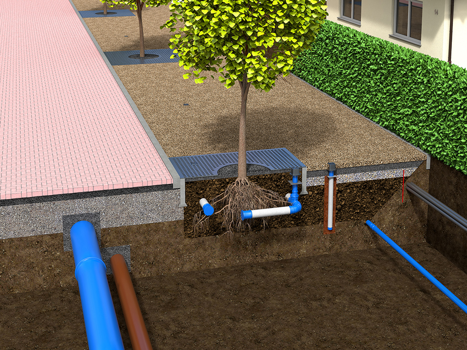 Die D-Raintank-Elemente übernehmen dabei die Lastabtragung der Fläche um den Baumstandort, was die bisher übliche Verdichtung des Subtstratkörpers (FLL Empfehlungen für Baumpflanzungen Teil 2, Pflanzgrubenbauweise 2 – überbaubare Pflanzgrube) überflüssig macht. Auch die gezielte Zuleitung von gereinigtem Niederschlagswasser über die D-Rainclean®-Sickermulde oder den Innolet Filter zum Einsatz in Straßenabläufe können zur deutlichen Verbesserung des Baumstandortes beitragen.