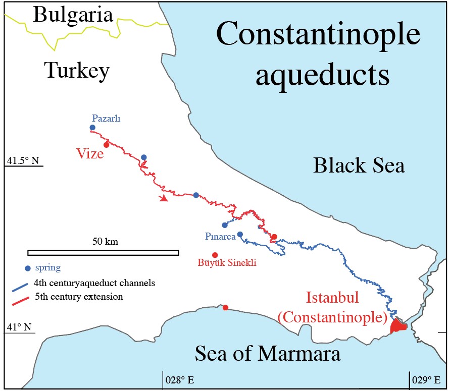 Der römische Kaiser Konstantin der Große hatte Konstantinopel 324 n.Chr. zur neuen Hauptstadt des Reiches bestimmt, doch obwohl die Stadt günstig an den Schnittstellen von Landwegen und Schiffsrouten lag, stellte die Wasserversorgung ein Problem dar. Daher wurde ein neuer Aquädukt gebaut, der die Stadtbevölkerung mit Wasser aus 60 Kilometer westlich gelegenen Quellen versorgen sollte.