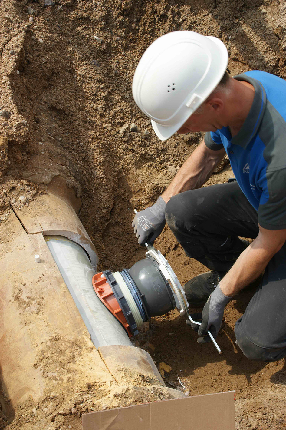 Funke-Fachberater Dipl.-Ing. Olaf Schreiter: „Der Einbau des Anschlusses erfolgt über ein Arbeitsfenster, welches mit einem geeigneten Werkzeug wie einem Winkelschleifer herzustellen ist. Um eine Beschädigung des Liners auszuschließen, empfiehlt sich hierbei der Einsatz der Funke-Anschlagscheibe zur Schnitttiefenbegrenzung. Bei der fachgerechten Montage der einzelnen Bauteile wird eine kraftschlüssige Verbindung zum Liner geschaffen, bei der bauartbedingte Unebenheiten des Liners ausgeglichen werden können.“