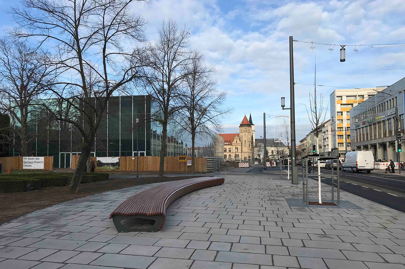 Die Stadt Dessau hat das 100-jährige Bestehen des Bauhauses zum Anlass für umfangreiche Baumaßnahmen genommen, mit denen die Attraktivität und Aufenthaltsqualität der Innenstadt verbessert werden soll. Eine davon war die Umgestaltung der zentralen innerstädtischen Verkehrsachse Kavalierstraße.