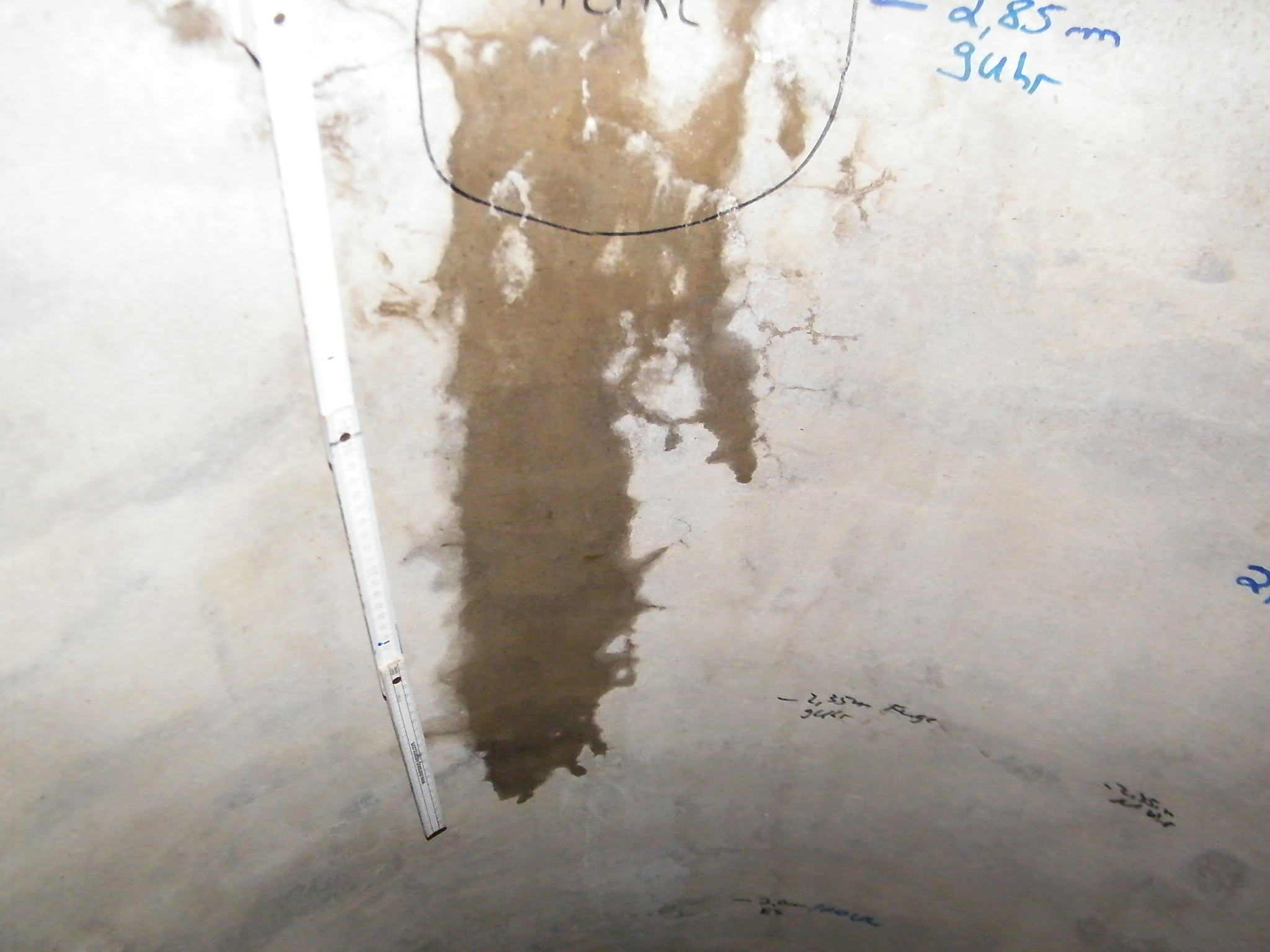 Hinsichtlich des Kriteriums „Infiltration“ zeigten sich an 33 von 48 Schadstellen (ca. 69 %) keine Auffälligkeiten. An allen sechs Mörtelbeschichtungen wurden Auffälligkeiten in Form von Feuchteflecken und/oder Fließfahnen festgestellt. Bei einer Kunststoffbeschichtung zeigten sich an einer von vier Schadstellen Auffälligkeiten in Form von infiltrierendem Wasser („Oldodur WS 56“). An den vier Auskleidungssystemen und der Kunststoffbeschichtung aus Epoxidharz wurden keine Auffälligkeiten festgestellt.