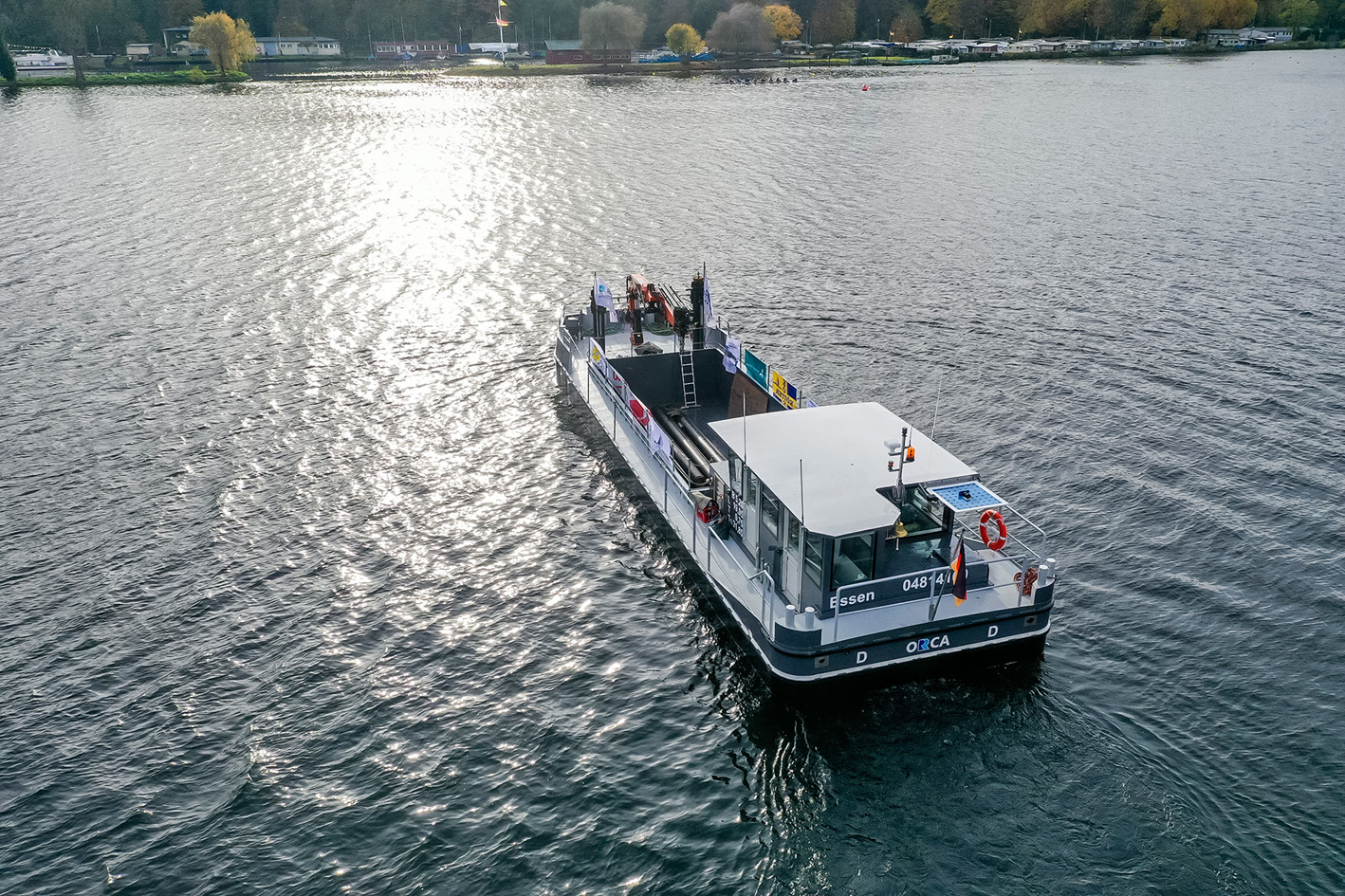 Imposante 19,95 Meter Länge und 5,20 Meter Breite misst das neue Arbeitsschiff des Ruhrverbands, die „Orca“. Ein neues Zuhause hat das – nach einem Schwertwal (Orca) benannte – Arbeitsschiff im Hafen Scheppen am Essener Baldeneysee gefunden. Neben einem weiteren Arbeitsschiff des Ruhrverbands sowie zahlreichen Motorbooten ist die „Orca“ hauptsächlich als „Allround-Arbeitsgerät“ zur Gewässerunterhaltung vorgesehen. Sie wurde auch speziell für Arbeiten an den Stauwehren am Baldeneysee und Kettwiger See konzipiert und verfügt aus diesem Grund über einen leistungsfähigen Kran sowie versenkbare Stelzen, um auch über größere Längen arbeiten zu können. Maßgebend für die Bemessung des Krans war unter anderem der Austausch der Schleusenantriebe des Untertors Baldeney vom Oberwasser aus. Die Breite der „Orca“ wurde so gewählt, dass das Schiff die Schleusen der Ruhr passieren kann.
