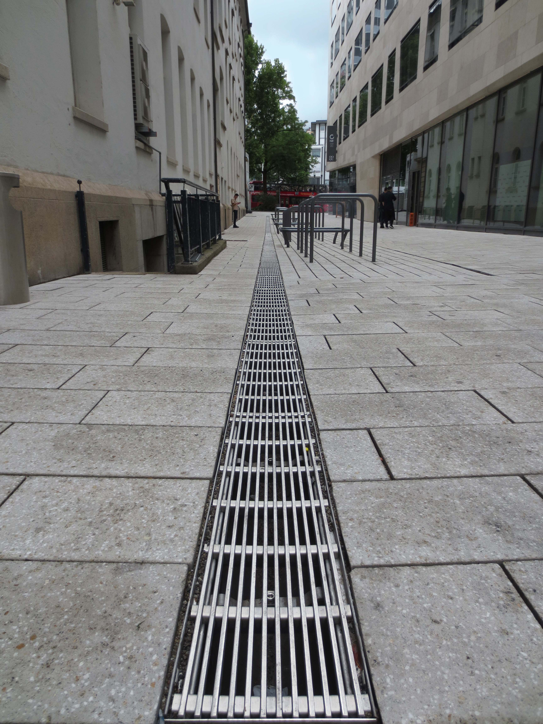 Hinter den Kulissen arbeitet ausgeklügelte Technik „Fachleute können erkennen, welche herausragenden technischen Leistungen hinter einem ambitionierten Bau wie diesem stecken: Hauraton hat für das DOQU eine von A bis Z individuelle Entwässerungslösung kreiert und umgesetzt“, erläutert der verantwortliche Ingenieur Dirk Kimmel aus dem Hauraton-Projektmanagement. „400 Meter Spezialrinnen kamen zum Einsatz.“ Vor allem die Hydraulik war knifflig, verlangte viel Know-how und beschäftigte das hochmotivierte Team des badischen Entwässerungstechnologen über Monate – schließlich waren große hydraulische Anforderungen mit der Erfüllung der Belastungsklasse D 400 und einem hohen Design-Anspruch unter einen Hut zu bringen. Die Hydraulik erforderte auch besondere Sicherheitsberechnungen, denn das Quartier liegt in einer Fußgängerzone.