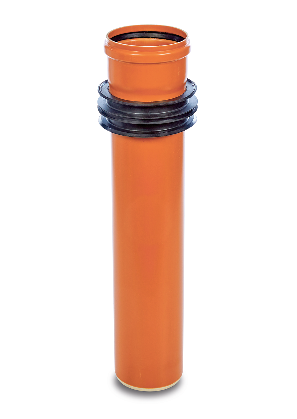 Einmal das HKD KG-Bodenelement DN 100 mit integraler Wassersperre. Hierbei handelt es sich um ein KG-Rohr mit Muffe, welches mit einem Dichtelement (Wasssersperre) aus EPDM versehen ist. Dieses kann im Bereich der Bodenplatte aus wasserundurchlässigem Beton gas- und druckwasserdicht direkt mit eingelassen werden kann.