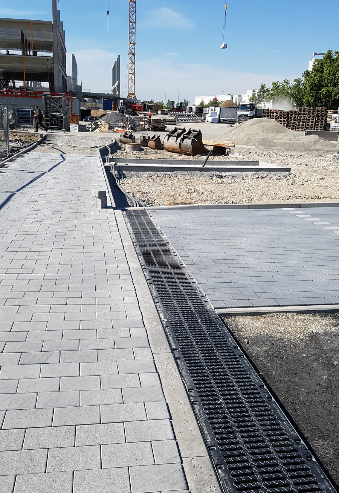 Die Vorteile beim Einsatz von Drainfix Clean Rinnen konnten die Verantwortlichen für den ambitionierten Bau schnell überzeugen und die ursprüngliche Überlegung, Oberflächenwasser in offenen Rigolen zu sammeln und vor Ort zu versickern, ablösen.