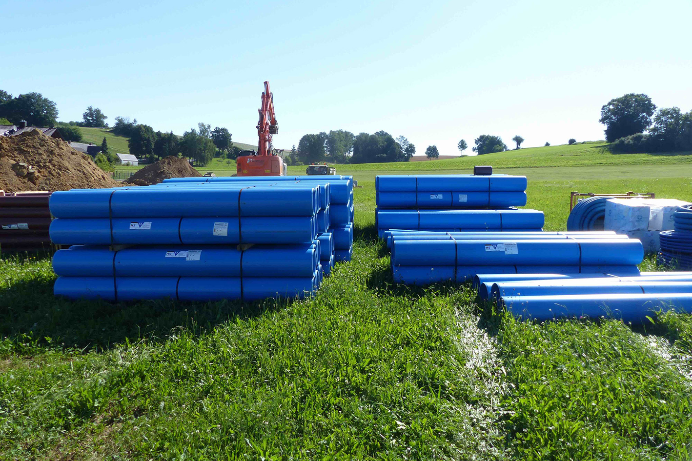 „Das passt optimal zu den Gegebenheiten in Röfingen. Denn hier wird im Trennsystem entwässert. Auch nach Jahren ist die Farbgebung der Rohre von braun für Schmutzwasserleitungen und blau für Regenwasserkanäle noch gut zu unterscheiden“, hebt Bauleiter Hubert Wolf vom Planungsbüro degen & partner mbb beratende Ingenieure einen der Vorteile der Produkte hervor.