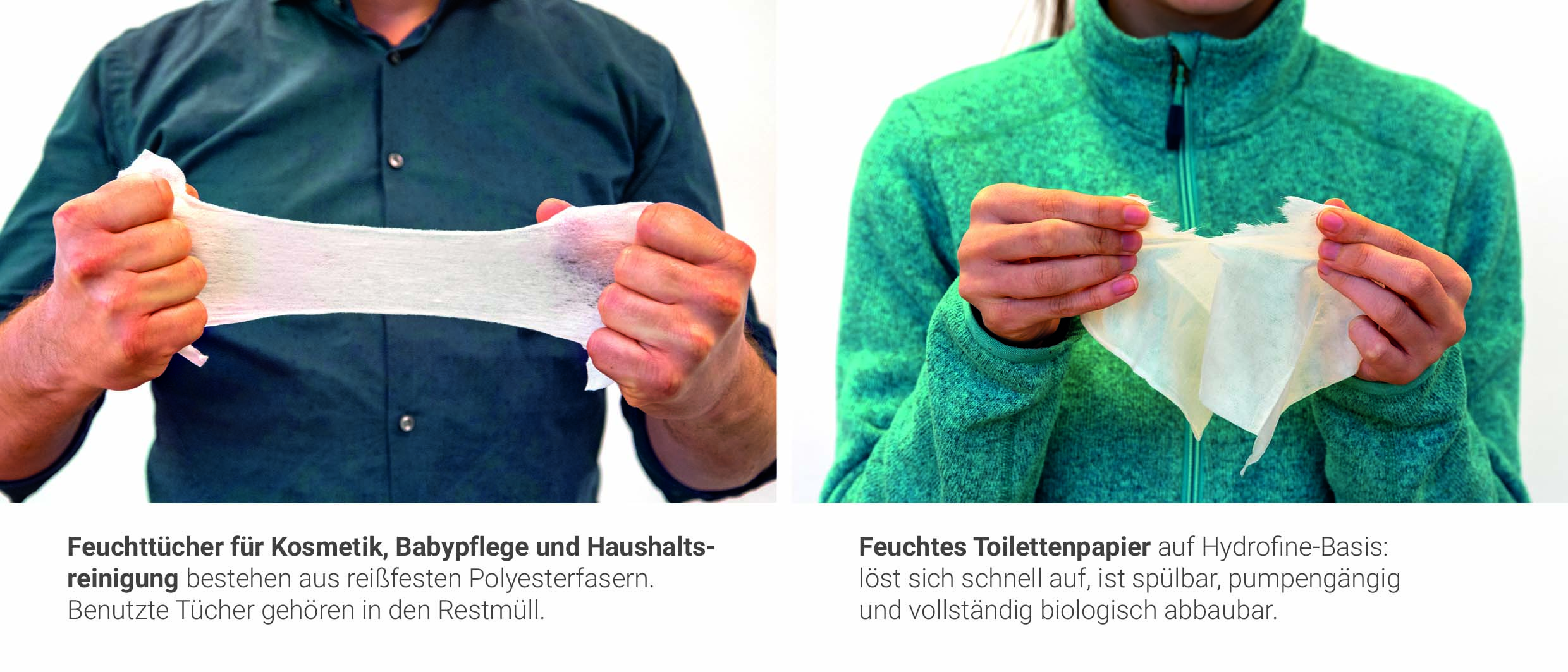 Demgegenüber besteht feuchtes Toilettenpapier aus einem wasserlöslichen Verbund aus Cellulose und Viskosefasern und kann über die Toilette entsorgt werden. Die Albaad-Gruppe hat mit dem neuen Werkstoff „Hydrofine“ ein Basismaterial für feuchtes Toilettenpapier entwickelt, das vollständig biologisch abbaubar ist und ohne chemische Binder und synthetische Fasern auskommt.