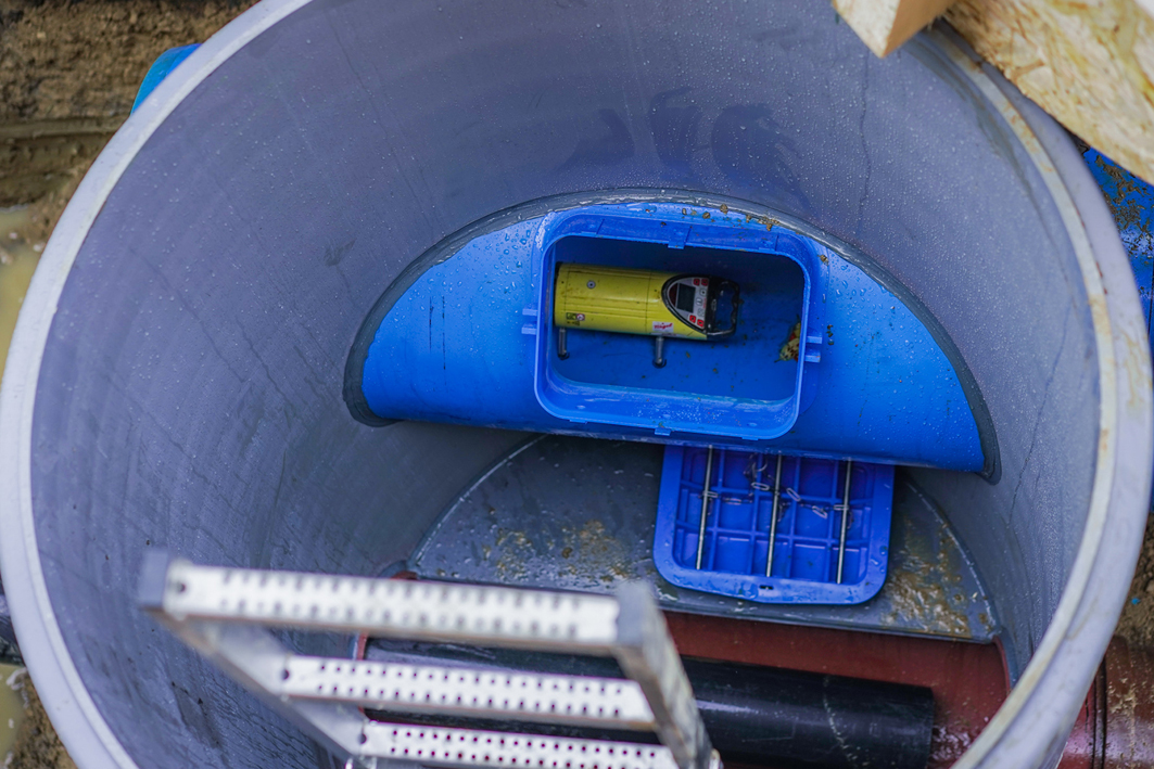 Genau für Einsatzzwecke wie in Laupheim ist der Funke Kombischacht DN 1000 gemacht. „Die Konstruktion ist ideal bei wenig Platz. Während das Schmutzwasser in einem offenen Gerinne geführt wird, fließt das Regenwasser durch ein geschlossenes HS®-Kanalrohr, das die Schachtwandung seitlich tangiert“, erläutert Funke-Fachberater Gerald Barth. Trotz der geschlossenen Rohrdurchführung ist dennoch eine einfache Inspektion der Regenwasserleitung möglich. Eine 320 mm x 230 mm große HS®-Laser- und Reinigungsöffnung im Schachtinneren sorgt in Laupheim für einen unkomplizierten Zugang. Aber auch bei kleineren Nennweiten ist eine Kontrolle sichergestellt. „In diesen Fällen wird das Rohr mit einem D = 200 mm Schraubdeckel ausgestattet“, so Barth.