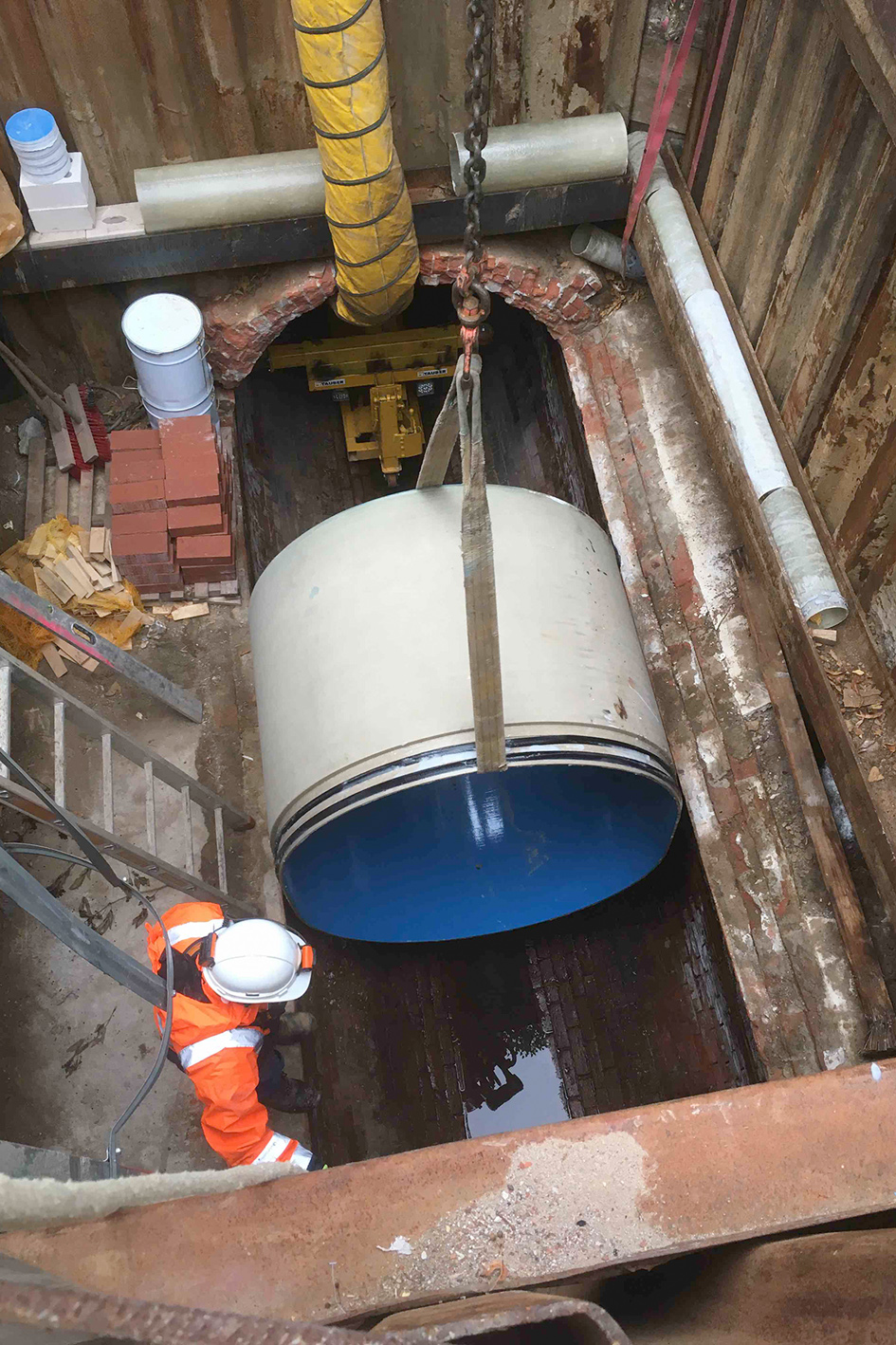 Für das Einfahren der Rohre errichtete Tauber Rohrbau sechs unterirdische Baugruben. Die eigentliche Verlegung erfolgte in vier Bauabschnitten und mithilfe eines bemannten Verlegewagens. Das sogenannte Rohrshuttle wurde eigens umgebaut und den Dimensionen des einzubauenden Profils exakt angepasst. Zunächst nahm das Shuttle das von einem Bagger in die Grube herabgelassene GFK-Profil auf. Anschließend wurde das Rohr bis ans Ende des bereits verlegten Relining-Strangs gefahren und mittels einer Steckmuffen-Verbindung mit diesen verbunden.