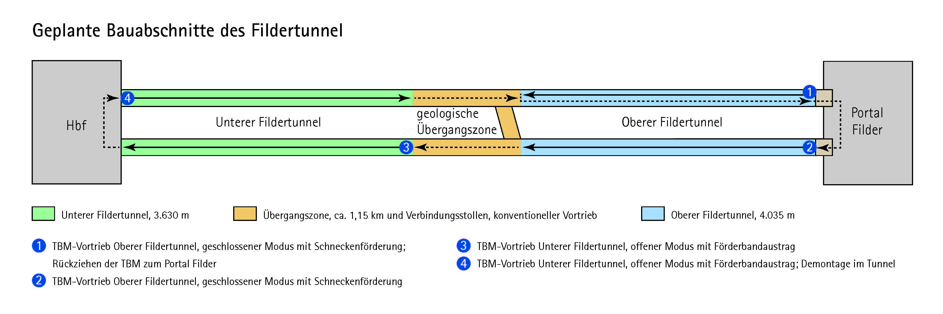Die Tunnelbohrmaschine ist eine Multi-Mode-Maschine. Das bedeutet, dass die Maschine umbaubar ist. Im oberen Abschnitt des Fildertunnels arbeitet sie im geschlossenen Modus mit Schneckenförderung, im unteren Fildertunnel im offenen Modus mit Förderbandaustrag. Der Grund dafür sind die unterschiedlichen Gesteinsschichten: Die Maschine muss Stubensandstein und Knollenmergel sowie unausgelaugten Gipskeuper durchdringen. Die Tunnelbohrmaschine überwindet eine Höhendifferenz von 155 Metern bzw. eine Steigung von bis zu 2,5 Prozent. Nur in der Mitte des Tunnels, in der geologischen Übergangszone, kommt die Maschine nicht zum Einsatz. Dort werden Mineure das Material mit Bagger und Lockerungssprengungen aus dem Berg lösen.