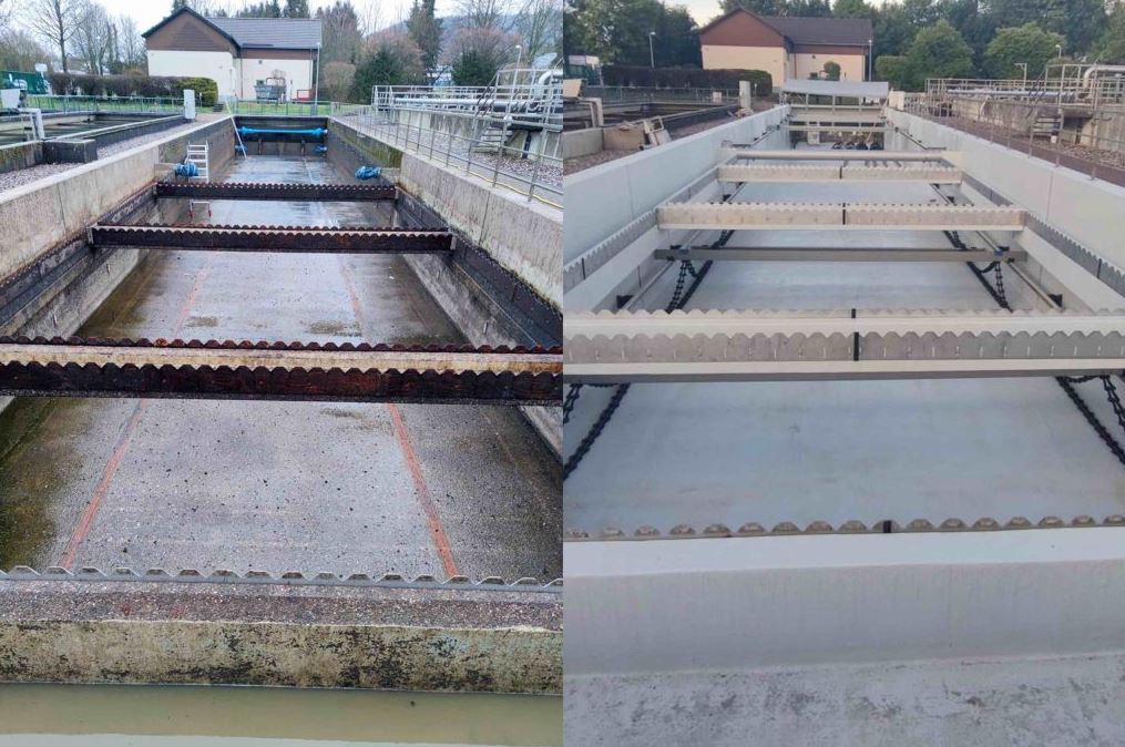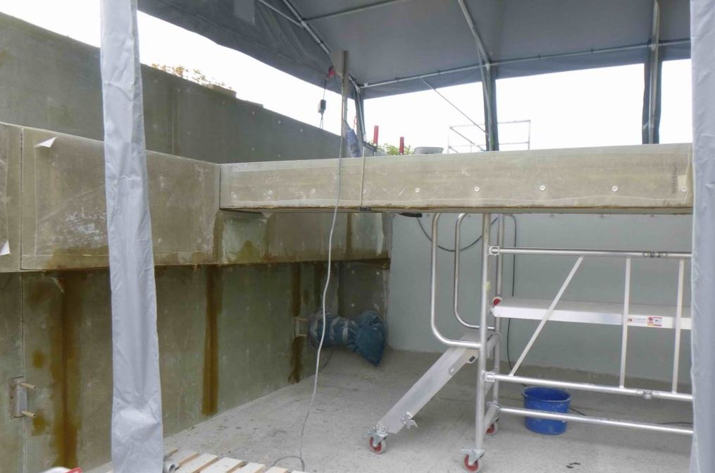 Die freiliegende Bewehrung wurde entsprechend den Anforderungen der Betoninstandsetzung mit Korrosionsschutz beschichtet und die korrodierte Bewehrung ersetzt.“ Im Anschluss daran startete die Auskleidung mit den GFK-Platten, die sich an einigen Stellen als Puzzlearbeit gestaltete, wie Heinz erklärt: „Im Nachklärbecken sind verschiedene technische Einrichtungen installiert, unter anderem ein Bodenräumer für den Schlammabzug. Dazu kommen mehrere querverlaufende Ablaufrinnen mit Zackenwehren, über die das geklärte Abwasser in längsverlaufende Rinnen geleitet wird.