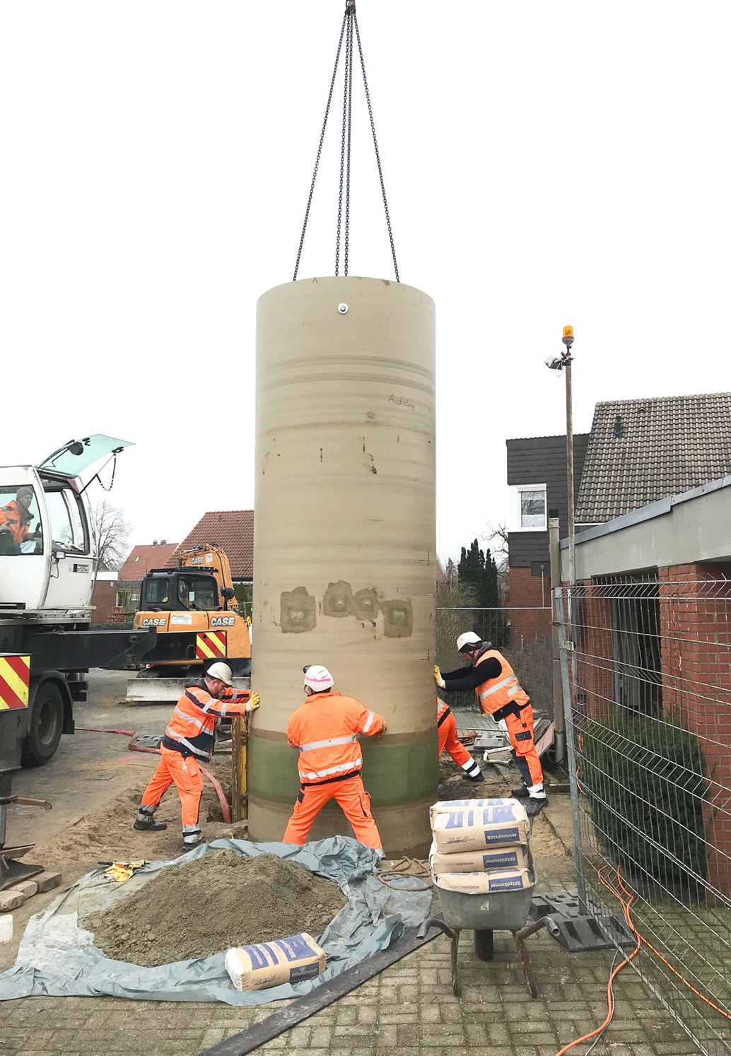 Zeitgleich finden das Ausstemmen und Ausräumen des alten Schachtes oder Pumpwerkes statt. Nach Ankunft auf der Baustelle kann das Fertigteil mit Hilfe eines Krans im alten Kanalschacht positioniert werden. Nach dem erfolgreichen Einbau werden die Zu- und Abläufe angebunden. Es folgt eine Dichtheitsprüfung nach DIN EN 1610.