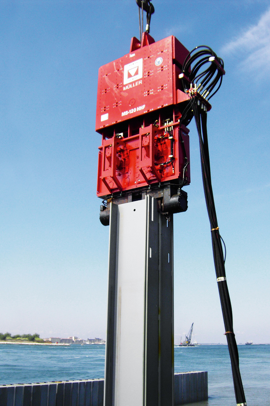 Zusätzlich bietet das müller Portfolio Seitengreifer an, die das Rammgut von der Seite greifen und in den Boden vibrieren können und so das Arbeiten bei begrenzter Bauhöhe ermöglichen. Zu den Einsatzbereichen zählen Ramm- und Zieharbeiten, das Einbringen von Spundwandprofilen und Rohren sowie von Kunststoffprofilen, Holzpfählen, Leichtprofilen und Bewehrungskörben. Erwähnenswert ist, dass die müller Baggeranbauvibratoren auch für schwingungssensible innerstädtische Bereiche und für einen Einsatz in schweren Böden geeignet sind.