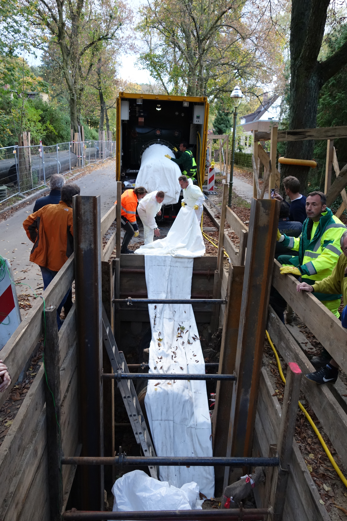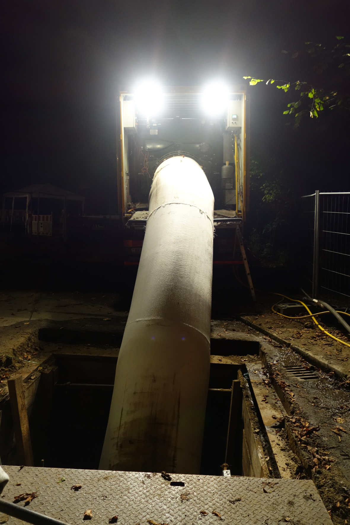 Die Liner wurden in jedem Bauabschnitt über vier Bögen mit jeweils 45° inversiert und anschließend mit Wasserdampf ausgehärtet. Das neu installierte Rohr ist allein tragfähig und übernimmt ohne Unterstützung des Altrohres alle anfallenden statischen Außen- und Innenlasten. Um einen dauerhaft dichten Übergang zwischen der bestehenden Rohrleitung und dem sanierten Teilstück zu schaffen, wurden die beiden Rohrenden des Liners mit RedEx® Linerendmanschetten der Pipe-Robo-Tec GmbH & Co. KG abgedichtet. Die Manschetten bestehen aus trinkwasserzugelassenem EPDM-Gummi und werden mit Edelstahlspannringen im Rohr verspannt.