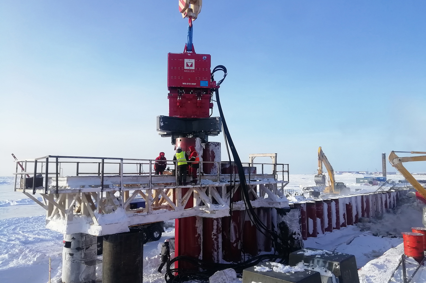 Angesichts arktischer Temperaturen war dies besonders wichtig, denn die darin enthaltenen Vorwärmeinrichtungen für das Hydrauliköl und das Kühlwasser des Dieselmotors schonen die Anlagenkomponenten und erhöhen so deren Betriebsbereitschaft und Lebensdauer. Über jeweils 120 Meter lange Schlauchleitungen wurde der Volumenstrom an die Vibrationsrammen weitergeleitet. Auf diese Weise war es möglich, Stahlrohre in Tiefen zwischen 25 und 60 Metern in den Boden einzubringen. Hierbei sorgten jeweils vier MS-U 180 GP-Spannvorrichtungen – montiert an einer Konsole MS-KX 320 – für eine schwingungsfreie Verbindung der Rohre mit der Vibrationseinheit.