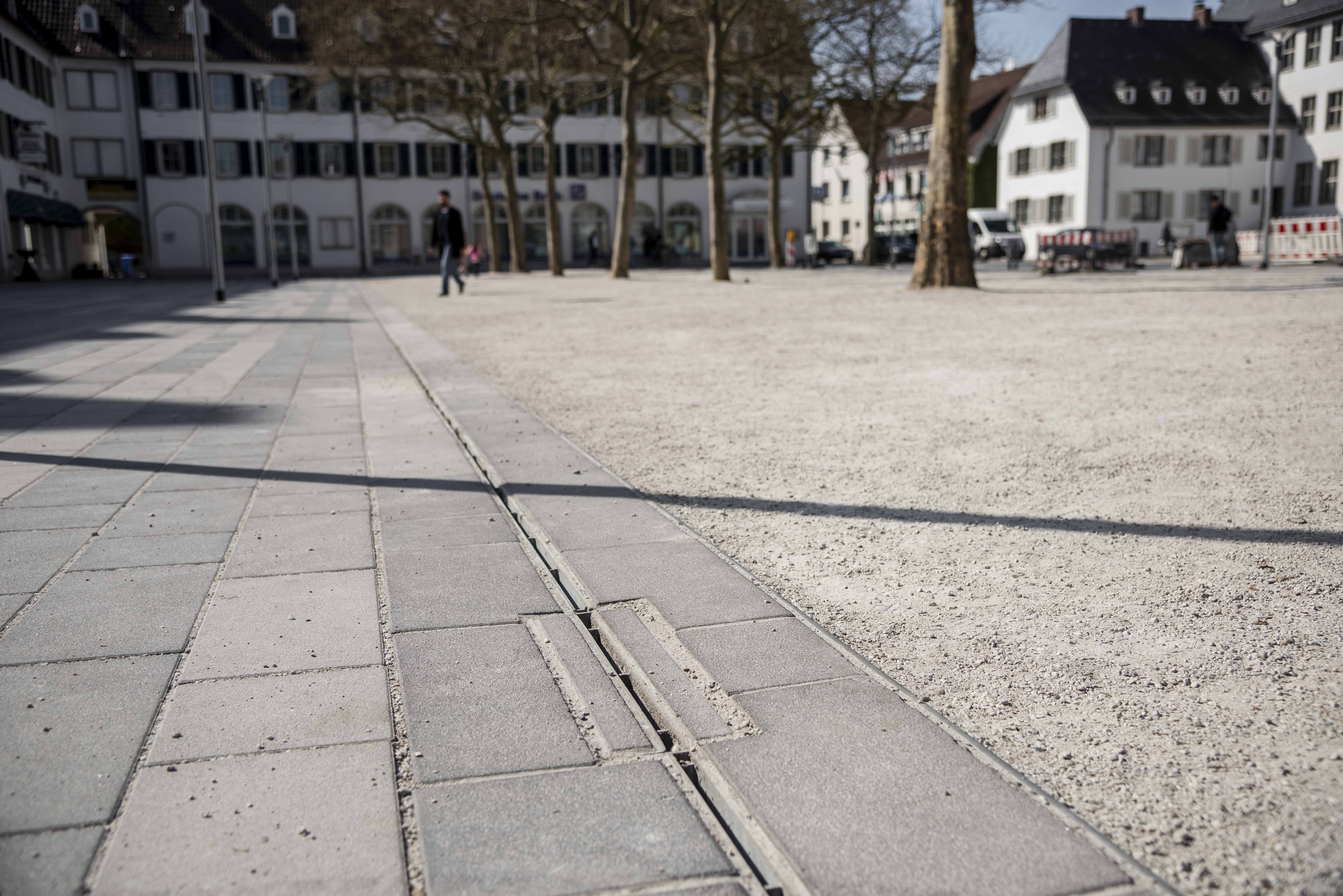 Aufgabe: Der Markplatz war komplett neu zu gestalten, wobei der alte Baumbestand erhalten werden sollte. Ein wichtiger Aspekt in der Planung war die Auswahl der Oberflächenentwässerung: Die Rinnen sollten möglichst behutsam und unauffällig in die Architektur des Platzes integriert werden und sich harmonisch an den hochwertigen Plattenbelag anpassen. Gleichzeitig musste gewährleistet werden, dass Lieferfahrzeuge – beispielsweise an Markttagen – das Areal ohne Schwierigkeiten befahren können. Das bedeutet, dass die verwendeten Bauelemente, also auch die Entwässerungsrinnen, der Belastungsklasse D 400 entsprechen müssen. Ausgewählt wurden für Rüsselsheim Faserfix Standard E 100 Rinnen mit Schlitzabdeckungen von Hauraton.