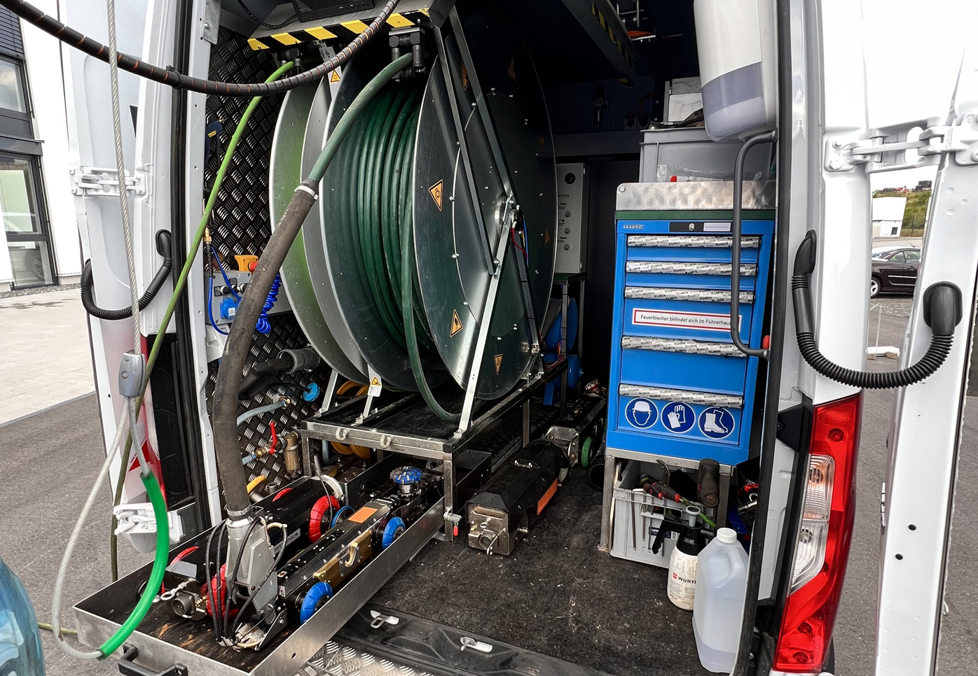 Katec investiert jetzt in eine weitere Anlage dieser Art – mit individueller Anpassung und Sonderausstattung. Sie ermöglicht unter anderem mit einer doppelten Batteriekapazität längeres autarkes Arbeiten mit dem Sanierungsroboter. Zudem dient eine spezielle Trommelführung der Effizienzsteigerung und schont die Kabelpakete. Auch die Unabhängigkeit von einem Generator ist bei der neuen Anlage gegeben. Hierzu ist jetzt auch der dazugehörige Anhänger mit einer Akkulösung ausgestattet. Diese ermöglicht beispielsweise das elektrische Anmischen der verwendeten Harze, ohne dass dazu ein Generator gestartet werden muss.