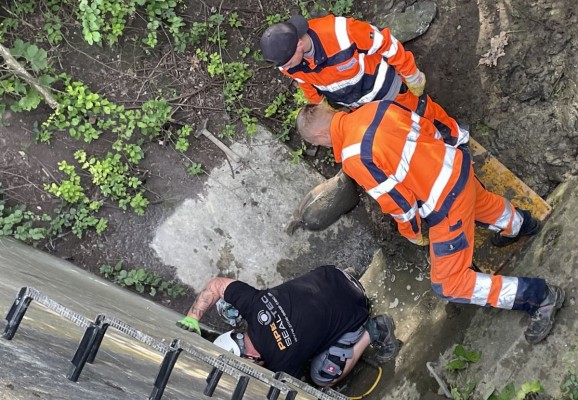 Die Montage der ersten Liner-Endmanschette erfolgte am südlichen Ende der Kanalrohrs. Über eingelassene Steigeisen in der Betonwand ging es für die Kanalprofis der Sanierungstechnik Dommel GmbH am Werthweg etwa drei Meter in die Tiefe. Eine gute Zugängigkeit war jedoch an beiden Sanierungsenden gegeben: Während die Haltung am nördlichen Ende über einen Schachtzugang möglich war, lag das südliche Ende auslaufend offen. Zur Unterstützung der Montage war ein Servicetechniker von Pipe-Seal-Tec vor Ort.