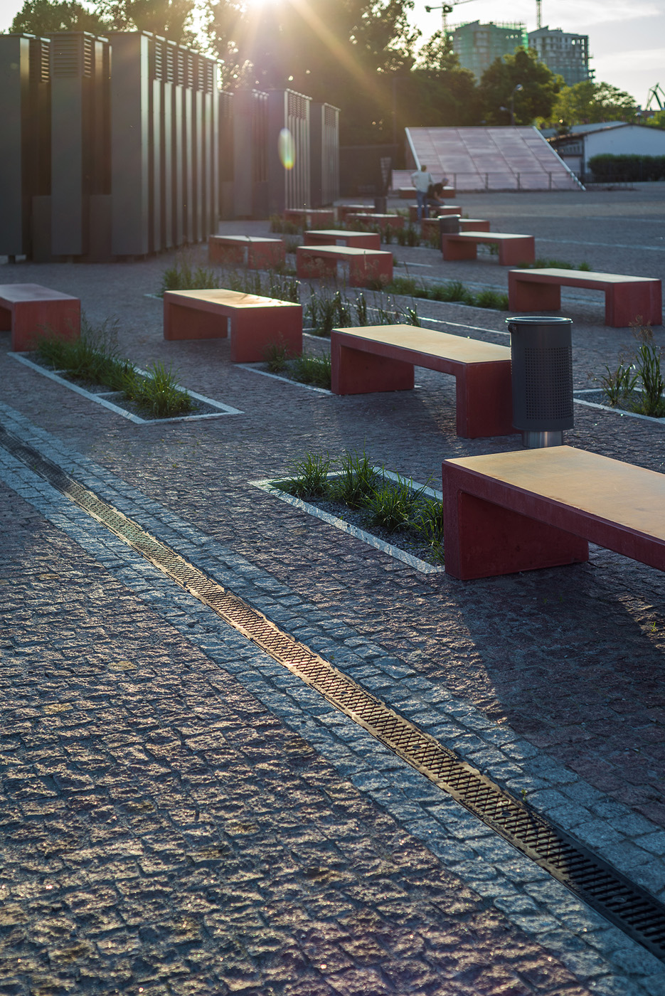 Der den Turm umgebende Platz bildet gleichzeitig das Dach des unterirdischen Museumsteils. Entwässerungslinien durchziehen seine gesamte Fläche, verlaufen unter den Füßen der Besucher ebenso wie über ihren Köpfen. Besondere Herausforderung: Da das Entwässerungssystem auf der Bodenplatte eingebaut wurde und der Abfluss nach unten durch die Bodenplatte geführt wird, war es nicht möglich, Einlaufkästen zu installieren.