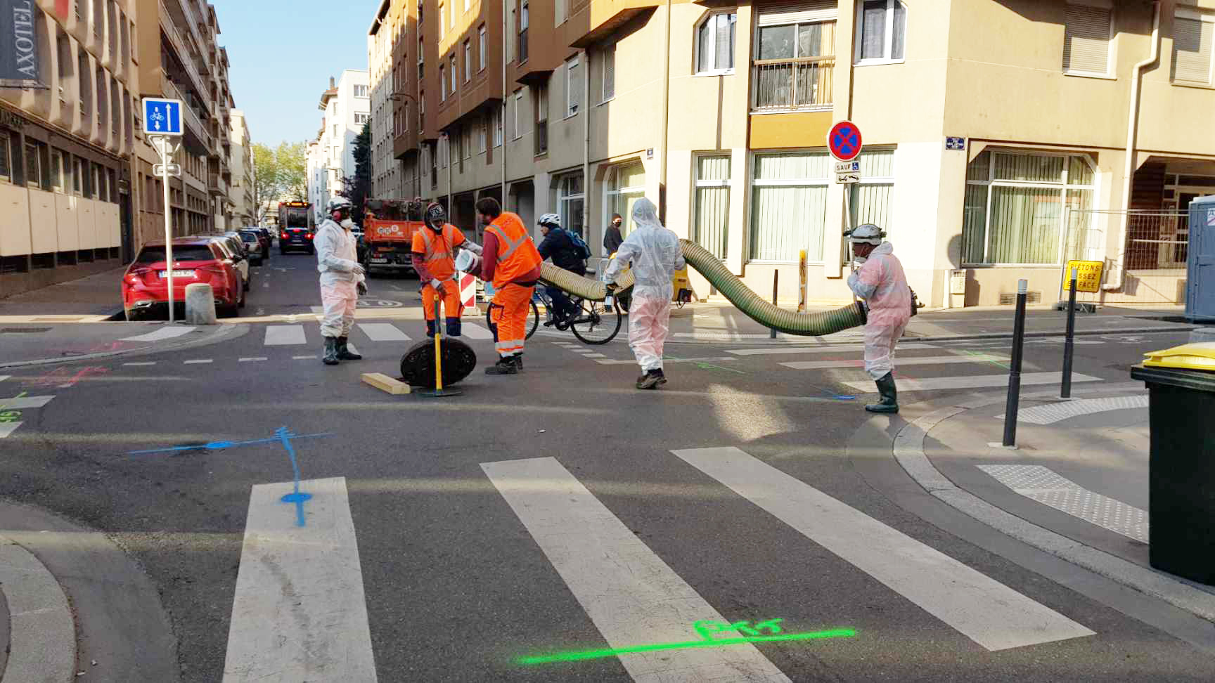 Der in die Jahre gekommene und zu sanierende Kanal war stark mit Rissen versehen. Es befand sich in einer seitlichen Leitung zur Hauptleitung unter der Hauptstraße, in der Stadtmitte von Lyon. Es war kein direkter Zugang von der Straße zum Seitenrohr vorhanden, von welchem aus die Sanierungsarbeiten hätten stattfinden können. Die einzige Möglichkeit den Liner zu installieren, war somit vom begehbaren Hauptrohr aus. Dies war die besondere Herausforderung bei dem Projekt.