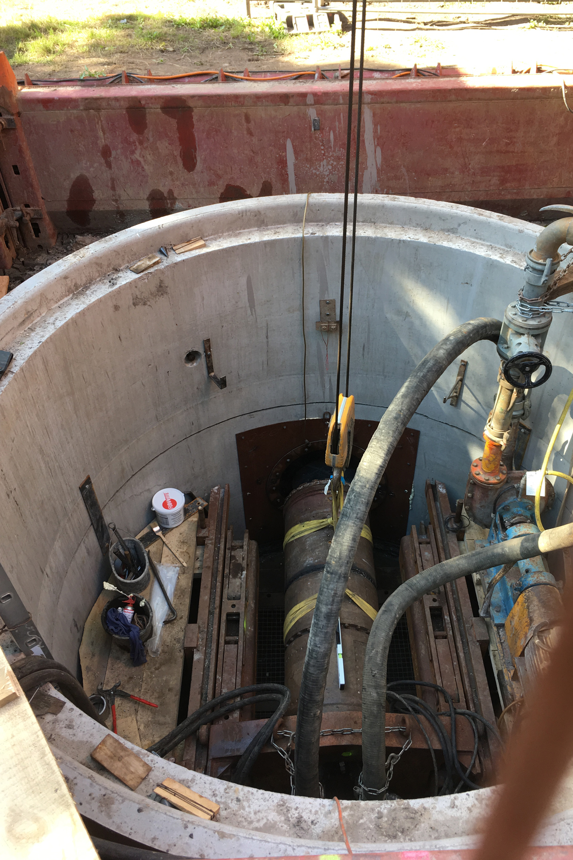 In Vorbereitung auf die Vortriebsarbeiten wurden beidseitig des Bahndamms 3,20 m bzw. 2,50 m tiefe Absenkschächte als Start- und Zielgrube mit einem Durchmesser von 3,20 bzw. 2,60 m hergestellt. Unter laufenden Bahnbetrieb wurde der Bahndamm 3 m unter den Gleisen aufgefahren.