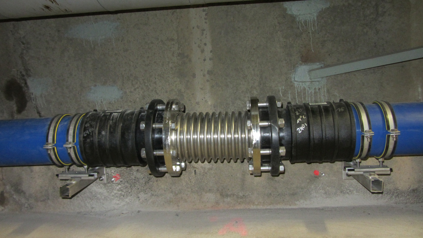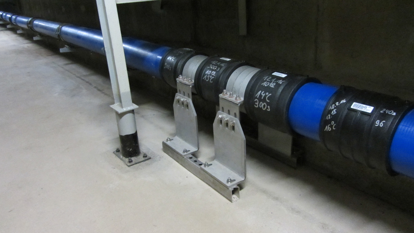 Verlegt werden sollte die neue Leitung auf Konsolen. Diese mussten teils als Festpunkte und teils als Gleitpunkte ausgelegt werden. An den Festpunkten wurde das Rohr mithilfe einer Edelstahlkonstruktion am Boden des Kollektors fixiert. Diese Festpunkte dienen der Aufnahme der Kräfte, welche infolge der temperaturbedingten Längenänderung der Rohre entstehen. Insgesamt neun in genau definierten Abständen eingebaute Axialkompensatoren DN 150 mit einer Baulänge von 270 mm +/– 40 mm stellen sicher, dass der Großteil der entstehenden Kräfte ausgeglichen wird und die Festpunkte lediglich einen geringen Teil aufnehmen müssen.