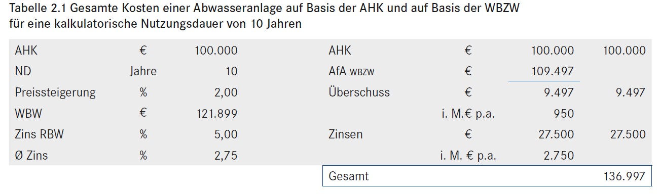 Tabelle 2.1: Gesamte Kosten einer Abwasseranlage auf Basis der AHK und auf Basis der WBZW für eine kalkulatorische Nutzungsdauer von 10 Jahren [Quelle: STEIN Ingenieure GmbH]