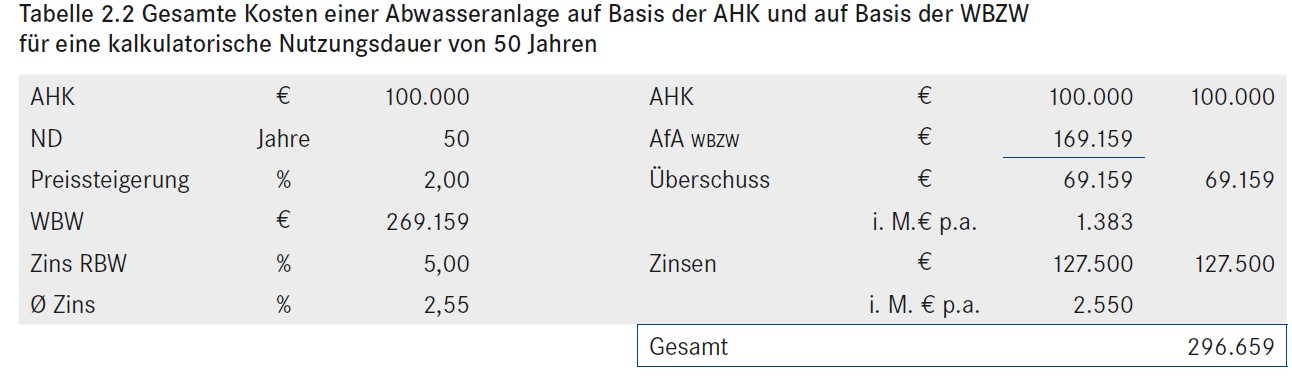 Tabelle 2.2: Gesamte Kosten einer Abwasseranlage auf Basis der AHK und auf Basis der WBZW für eine kalkulatorische Nutzungsdauer von 50 Jahren [Quelle: STEIN Ingenieure GmbH]
