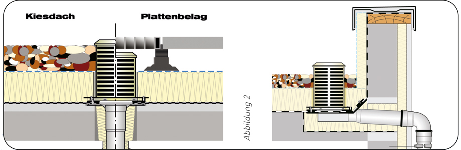 Dachabläufe in Umkehrdächern müssen das Regenwasser von den genannten drei Ebenen aufnehmen können. Die Abbildung 2 zeigt Beispiele für Umkehrdachabläufe, links mit Anschluss an die durch das Gebäude geführte Regenwasserleitung und rechts mit Anschluss durch die Attika an die außen am Gebäude geführten Regenfallleitungen.