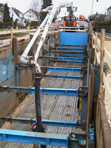 Auch im Handling spielte der Linearverbau seine Stärken aus. Die Elemente des Verbausystems waren sowohl beim Ein- als auch beim Rückbau leicht und schnell zu handhaben. Außerdem konnten die 3,75 m breiten, 3,40 m hohen und 3 m langen Betonfertigteile problemlos unter dem Verbau eingefädelt werden. Zuerst wurde eine 20 cm starke Betonsohle als Rohrauflager erstellt.