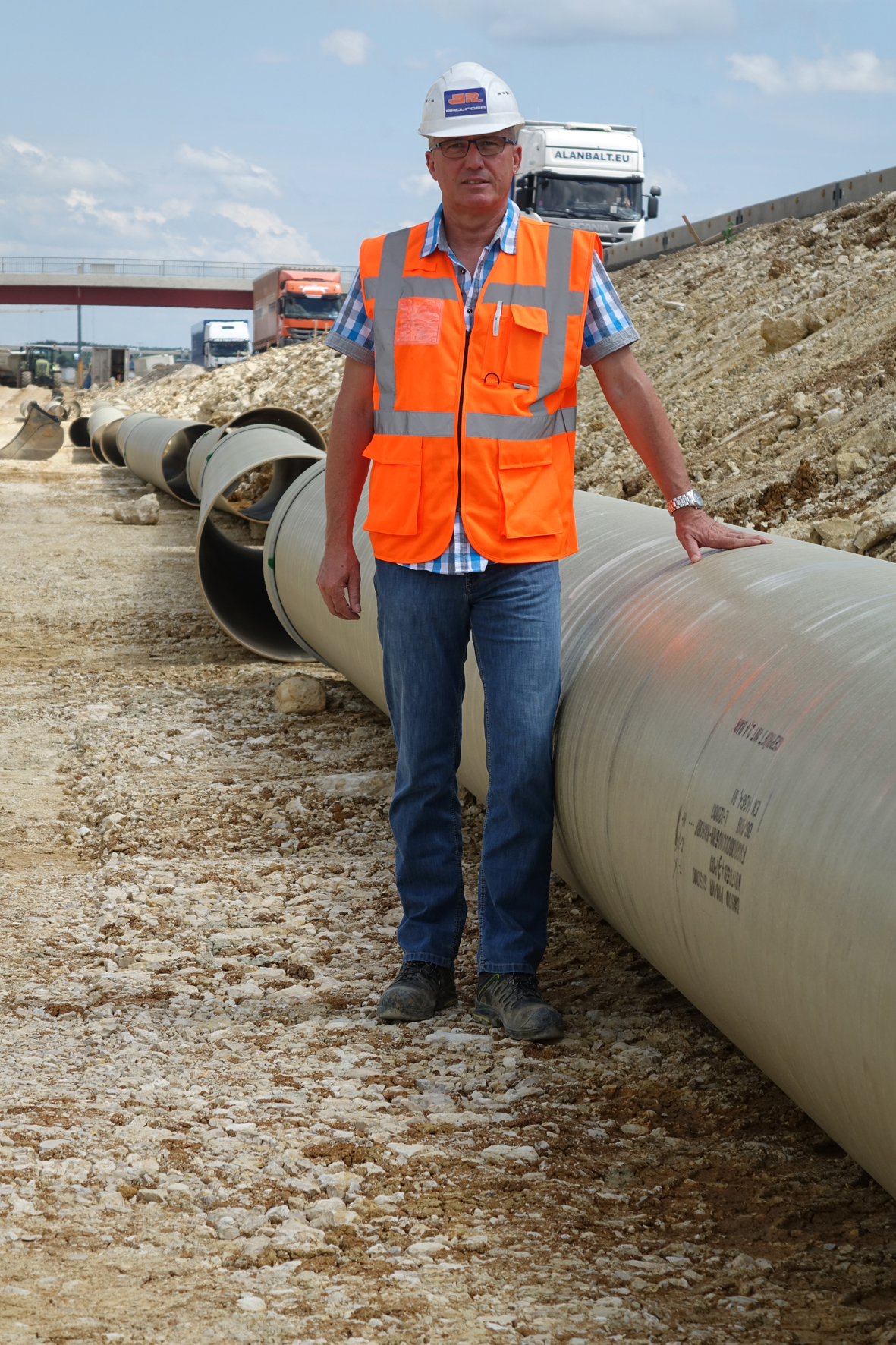 Gestemmt wird das Millionen-Projekt in vier Bauabschnitten, wobei der rund 6 km lange Bauabschnitt 4 zwischen Nellingen und Hohenstadt nach europaweiter Ausschreibung an die Josef Rädlinger Bauunternehmen GmbH aus dem oberpfälzischen Cham ging. Allein hier wurden ca. 551.000 m3 Boden verschiedener Bodenklassen abgetragen sowie 7 Brückenbauwerke bzw. Unterführungen erstellt, eines davon durch die DB Netz AG. Da sich das Baufeld in einem Wasserschutzgebiet III befindet, sind die Anforderungen an die Streckenentwässerung und die dabei verwendeten Rohrleitungen besonders hoch. So entschied sich das Regierungspräsidium Tübingen als Bauherr für die Verwendung des Flowtite GFK-Rohrsystems, das von der Amiantit Germany GmbH geliefert wird. Insgesamt kommen rund 10.000 m Flowtite GFK-Rohre in Nennweiten von DN 300 bis DN 1.200 im Mittelstreifen und beidseitig der Autobahn, unweit der Ortes Merklingen, zum Einsatz.