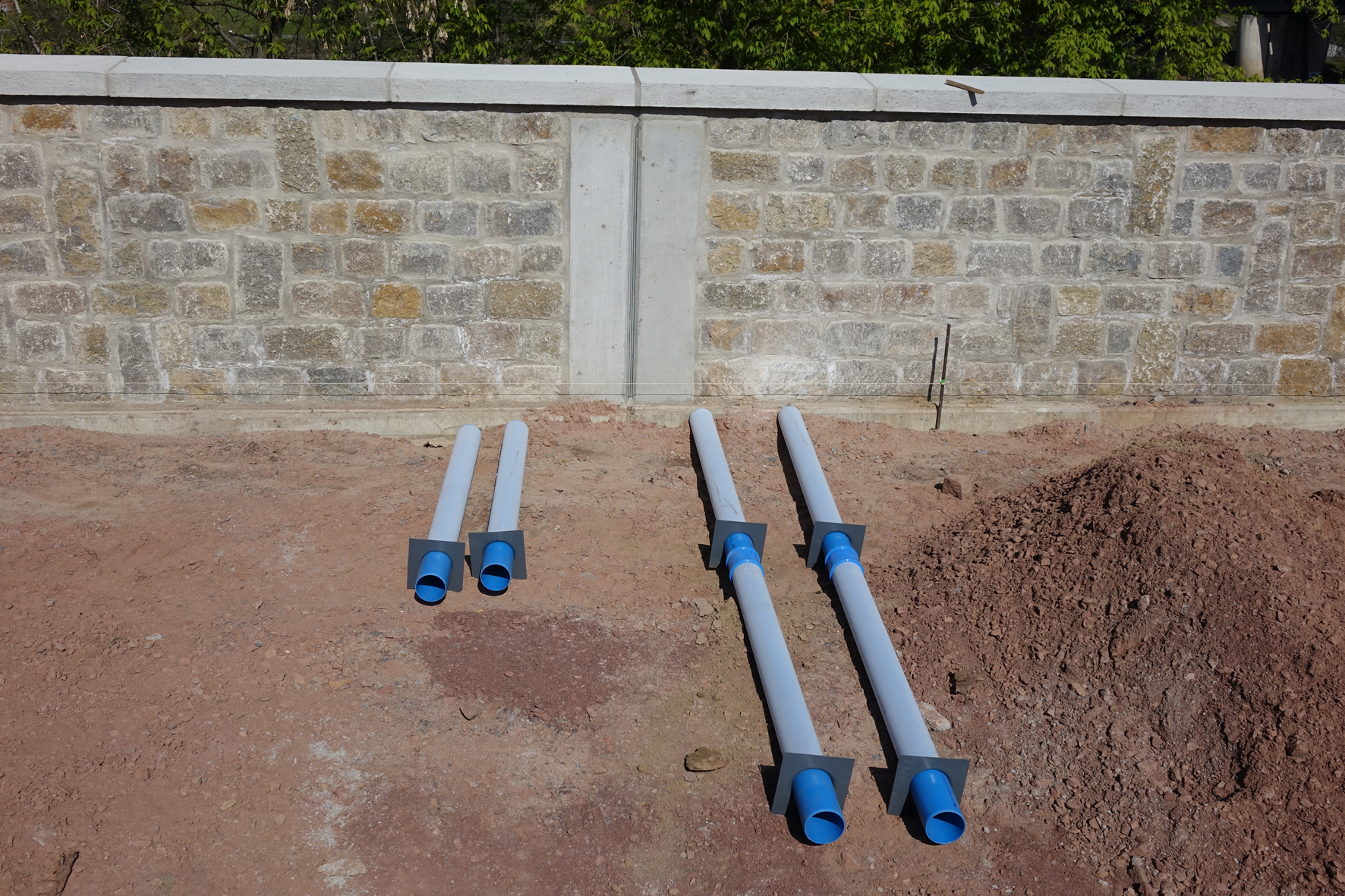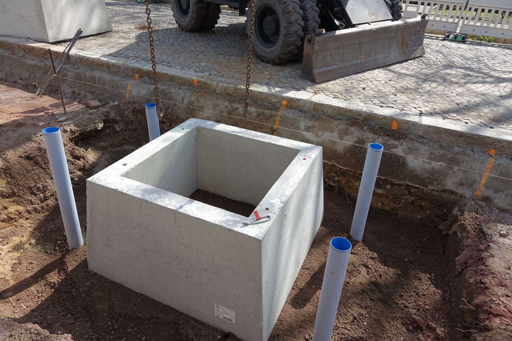 Im nächsten Schritt wurde die Grube verfüllt und die im Betonwerk als Sonderanfertigung vorgefertigte Betonschutzglocke gesetzt. Nach Füllen der Glocke mit Substrat bauten die Arbeiter von HEIN-BAU die Funke-Baumbewässerungswinkel ein. Die zu einem Winkel verbundenen geschlitzten und wandverstärkten Rohre der Nennweite DN/OD 160 werden im oberen Drittel des Wurzelballens eingebaut und versorgen den Wurzelbereich gezielt mit Wasser und Nährstoffen. Ein Baumbewässerungswinkel verfügt in der Standardausführung über eine Schenkellänge von ca. 1,36 x 1,62 m und fasst ca. 60 Liter Wasser.